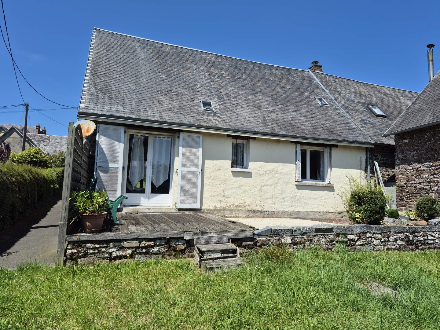 Maison en pierres et masse mitoyenne et couverture en ardoises naturelles d'une surface habitable d'environ 85m² sur un terrain d'environ de 334m² comprenant : - Au rez-de-chaussée : entrée, séjour avec coin-cuisine (21m²), 2 chambres, salle d'eau, wc sous escalier - A l'étage : palier, chambre Huisseries en bois simple vitrage avec volets battants bois et persiennes métalliques Chauffage électrique par convecteur. Classe énergie : F - Classe climat : C - Montant estimé des dépenses annuelles d'énergie pour un usage standard : 2370 à 3250 € (base 2022). Commodités : eau, électricité, fosse septique Charges : impot foncier « Les informations sur les risques auxquels ce bien est exposé sont disponibles sur le site Géorisques : www.georisques.gouv.fr » (nouv. Art. R 125-25 I, C Env.)