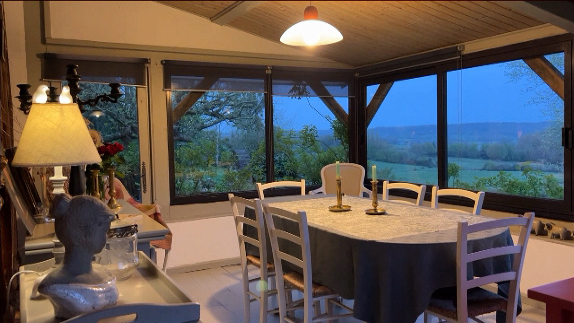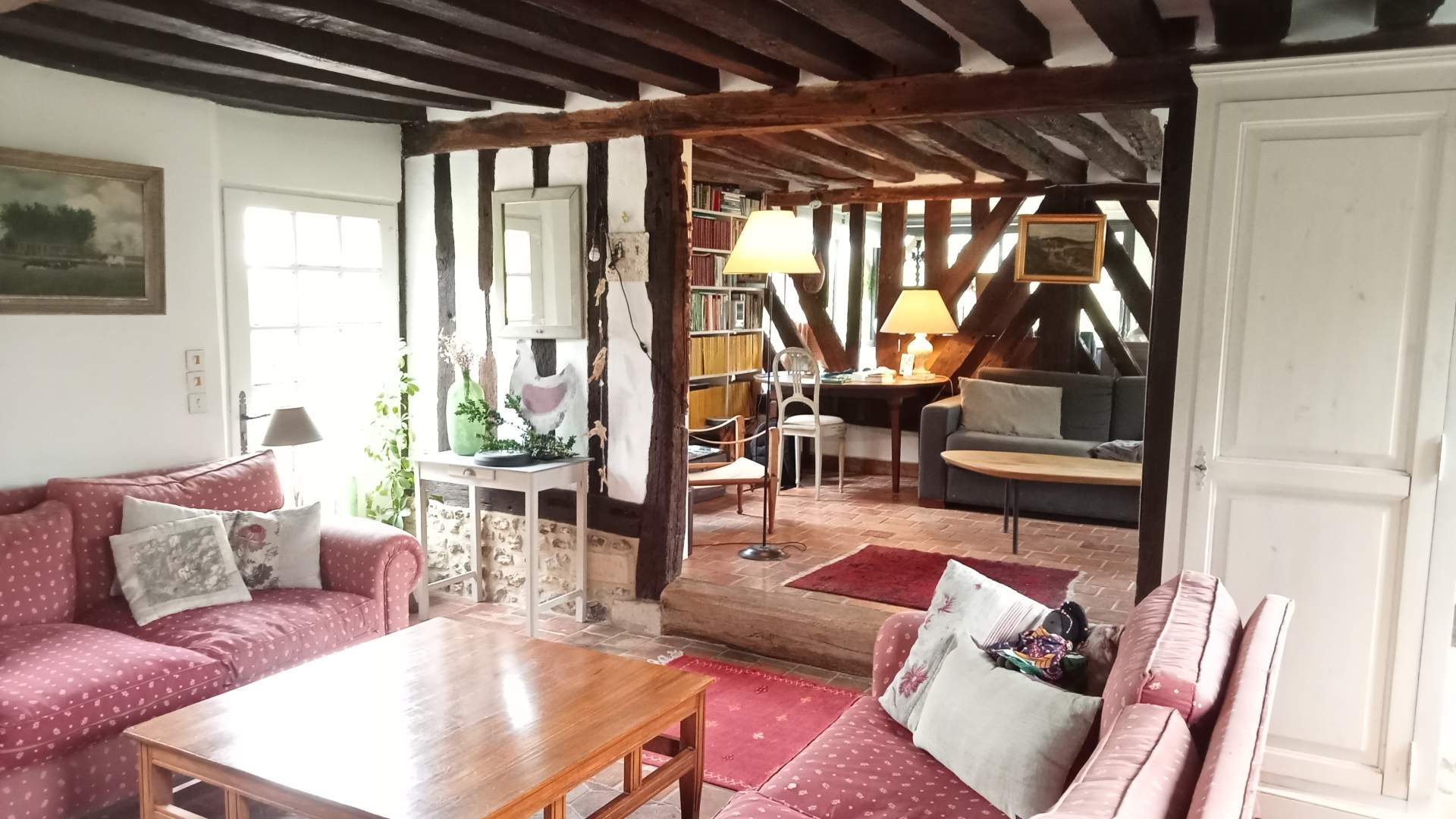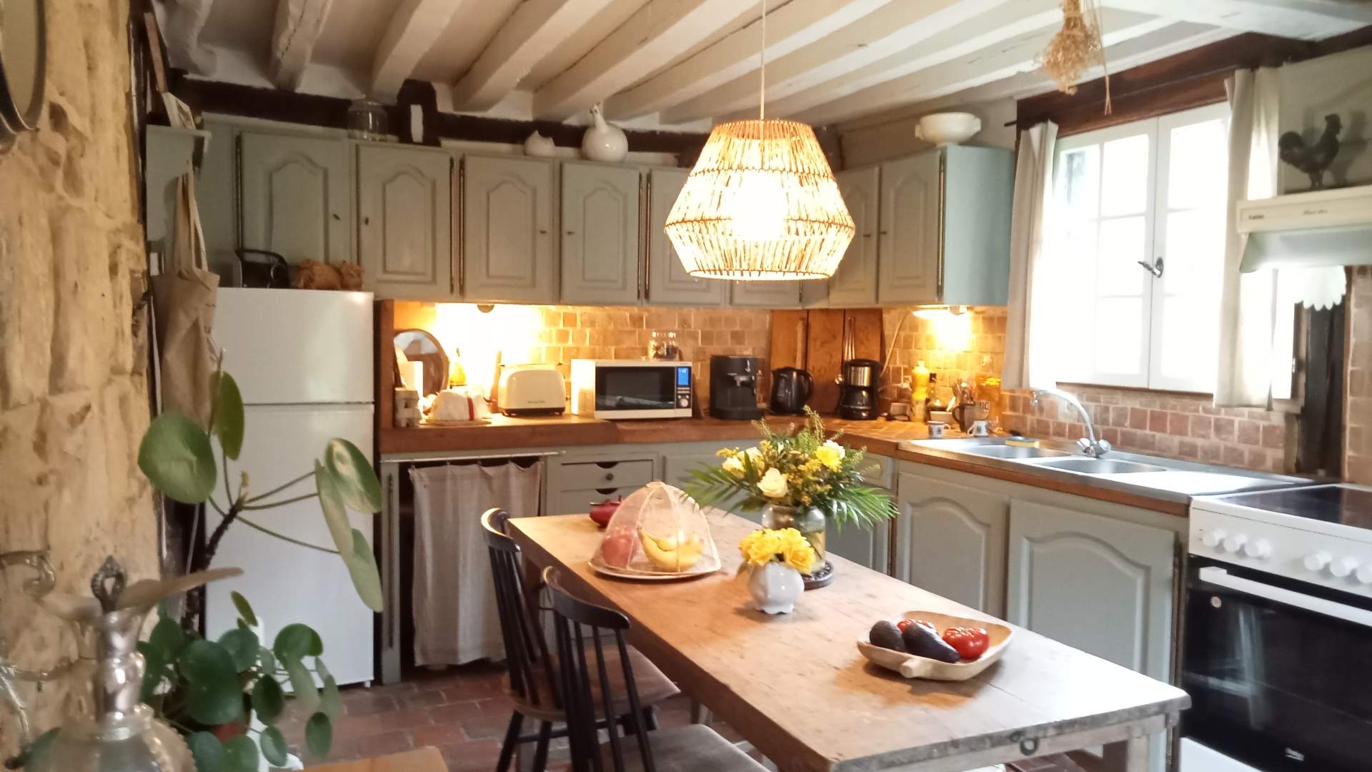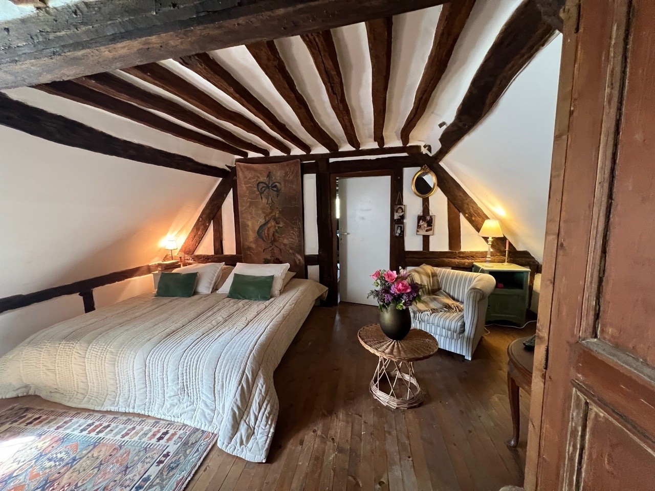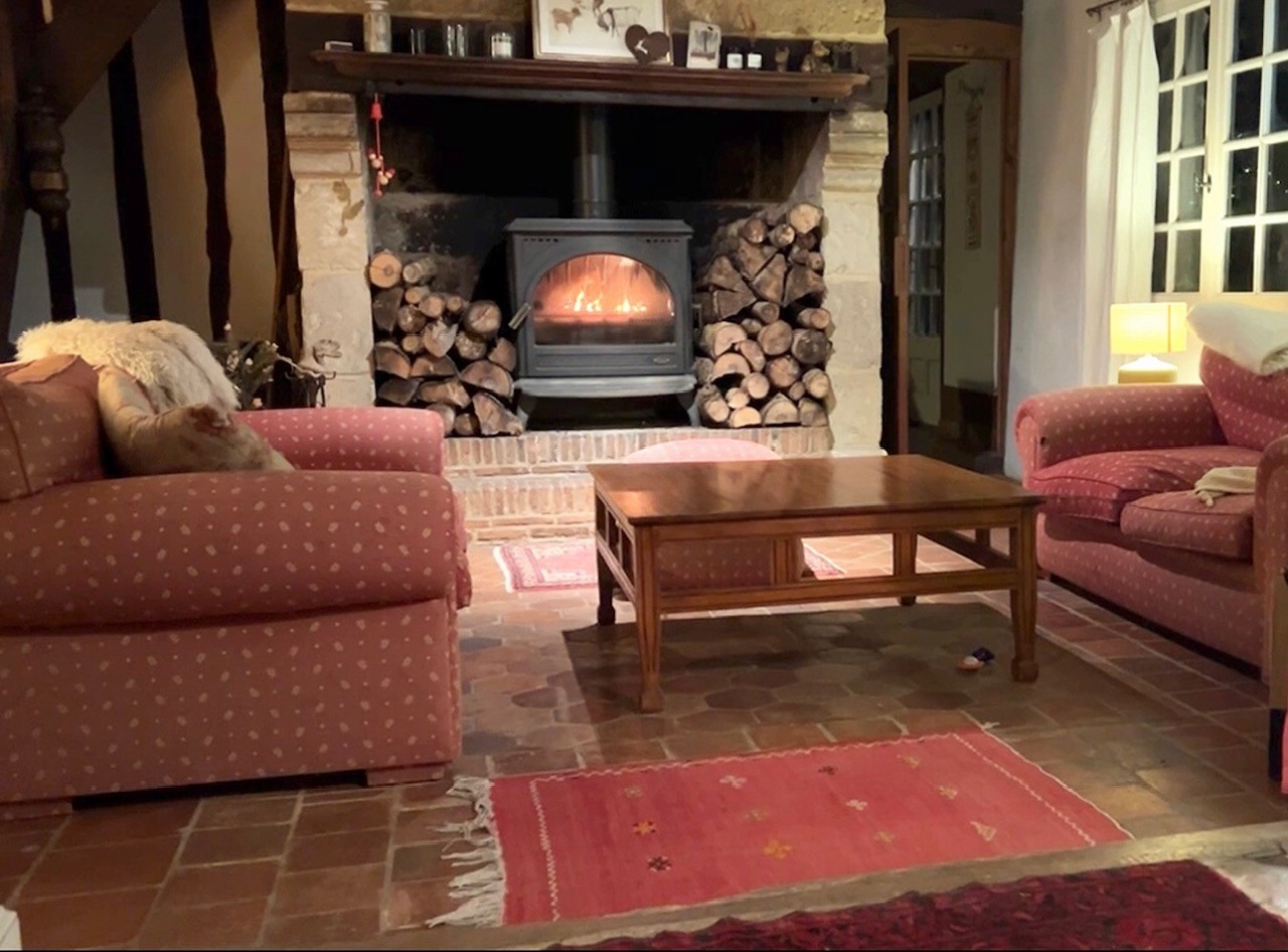 Elle offre au rez-de-chaussée de belles pièces de vie : une cuisine dinatoire au charme rustique, idéale pour les moments conviviaux, ainsi qu’une véranda bénéficiant d’une vue imprenable sur la campagne vallonnée du Pays d’Auge. Un séjour double, agrémenté d’une cheminée ancienne, complète cet espace chaleureux et plein de caractère.