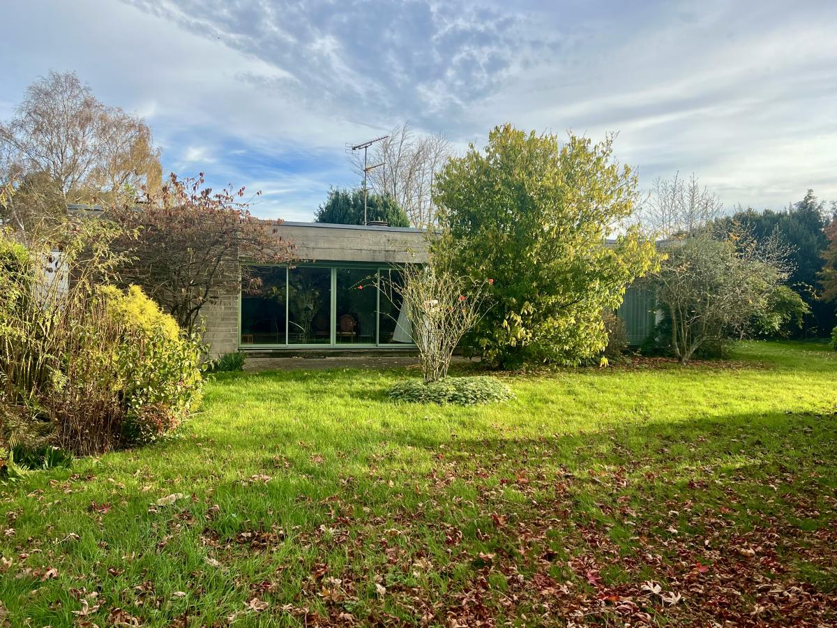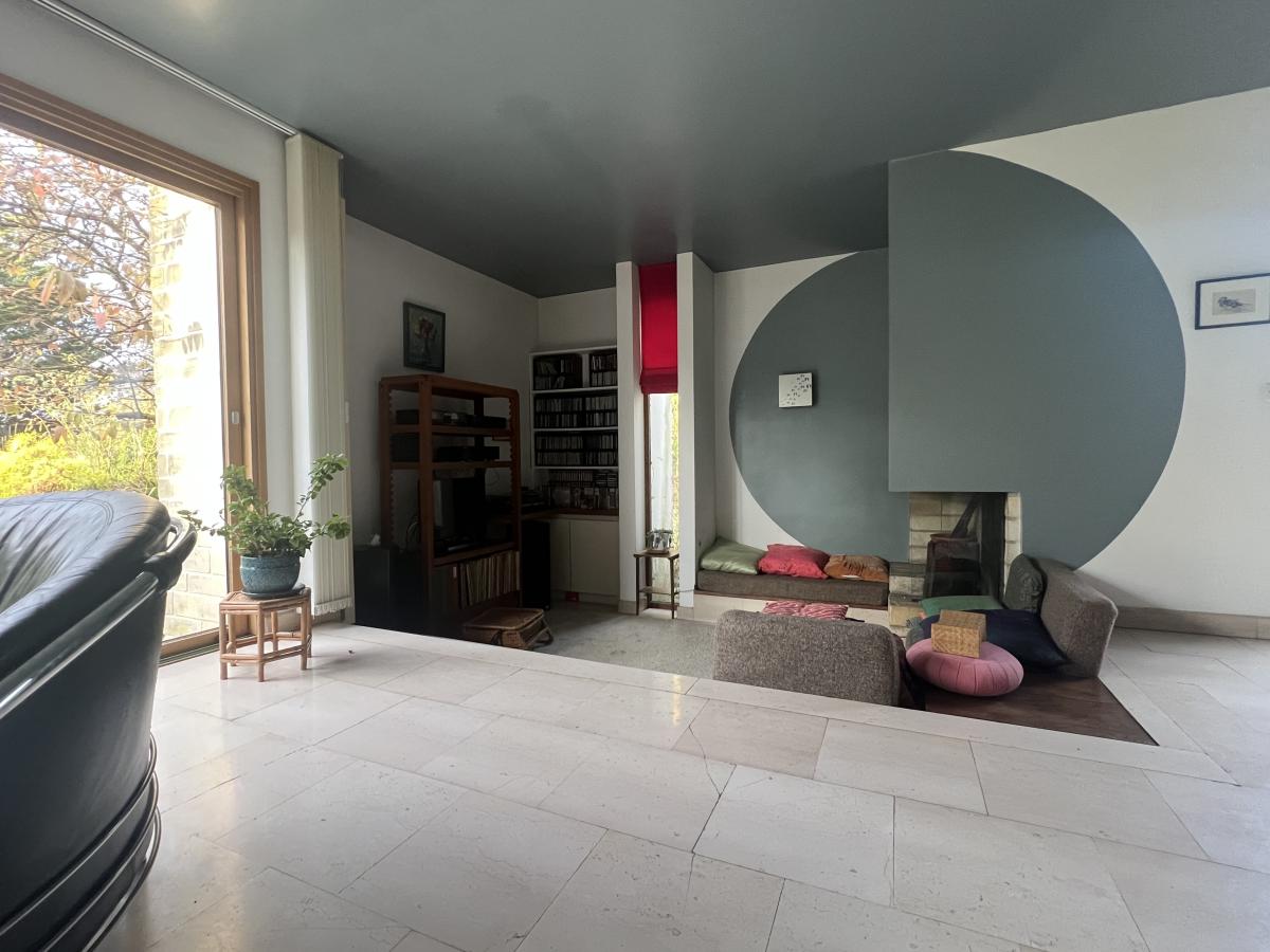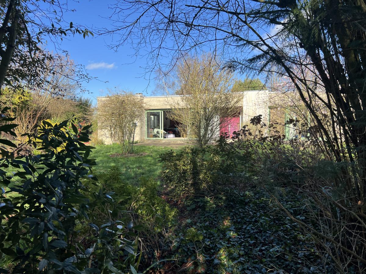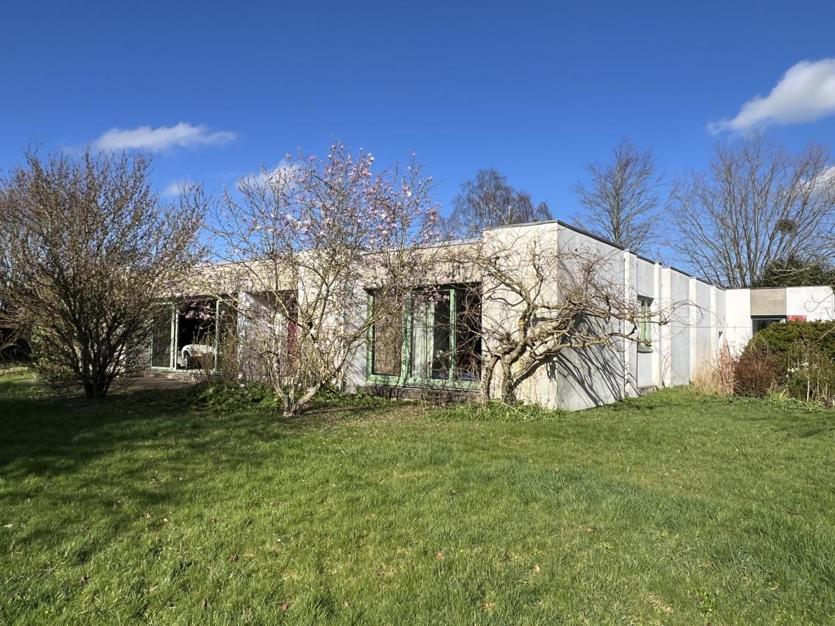 BIEVILLE BEUVILLE - CAEN nord bus de ville - HORS LOTISSEMENT - Atypique maison d'architecte de plain pied de 166 m2, comprenant entrée, séjour salon avec cheminée 46 m2, cuisine, 5 chambres dont une avec salle de bains, 2 salles d'eau, bureau, arrière cuisine, wc. Garage attenant de 40 m2. Double garage en annexe. Terrain 3800 m2. Travaux à prévoir. DPE : F