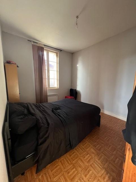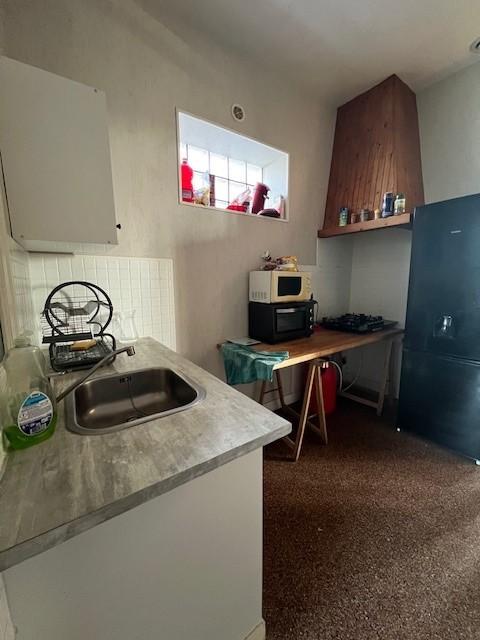 Entrée dans le séjour-salon, une chambre, cuisine, dégagement ouvrant sur l'arrière et desservant une salle d'eau, un WC, et une cave.
