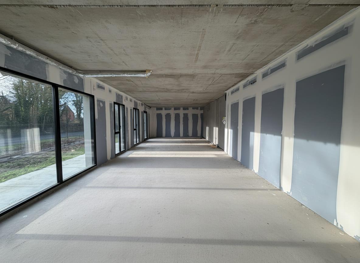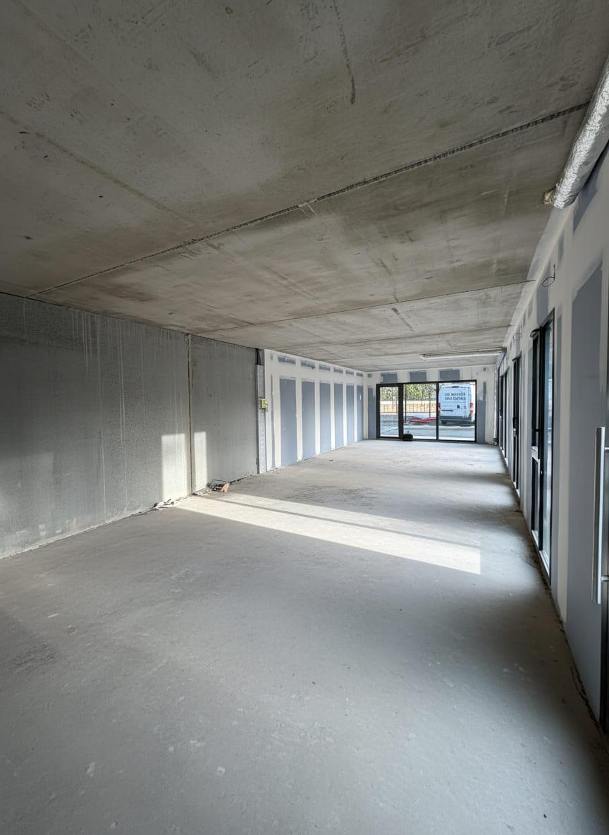 Au rez-de-chaussée d’un ensemble immobilier neuf en copropriété, local commercial de 78 m², livré brut de béton, fluides en attente et vitrine posée.