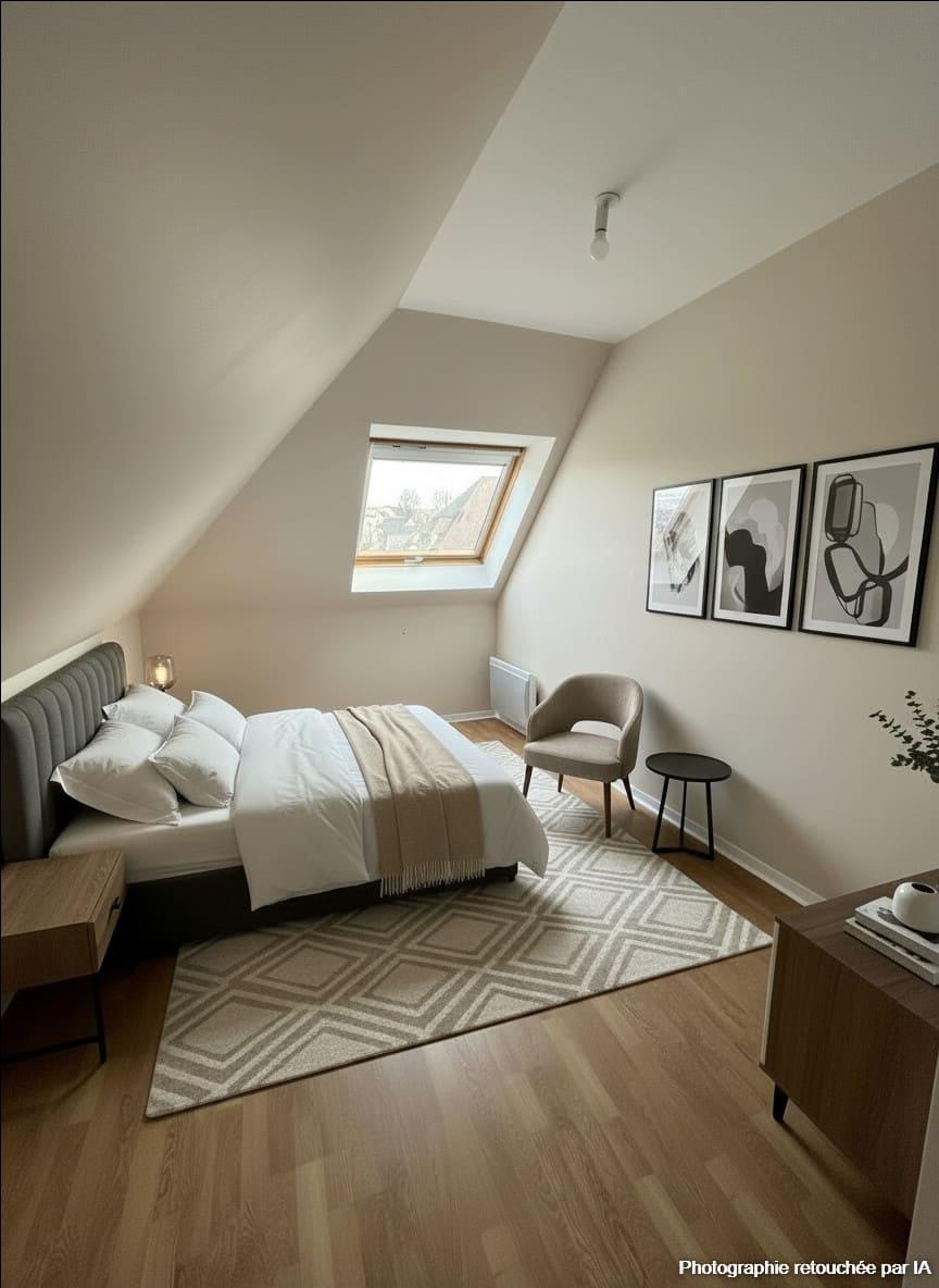 À l’étage, l’espace nuit propose 3 chambres, au calme, et une salle de bains, permettant une séparation confortable entre les espaces jour et nuit.