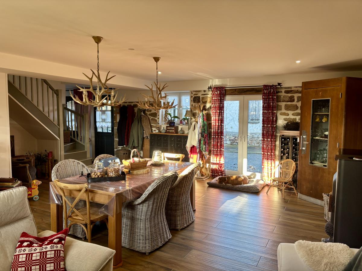 - Au rez-de-chaussée : un porche d’entrée, un salon chaleureux avec poêle à bois, une grande cuisine conviviale, une vaste pièce de vie lumineuse regroupant salon et salle à manger et un autre poêle, WC, cellier et chaufferie.