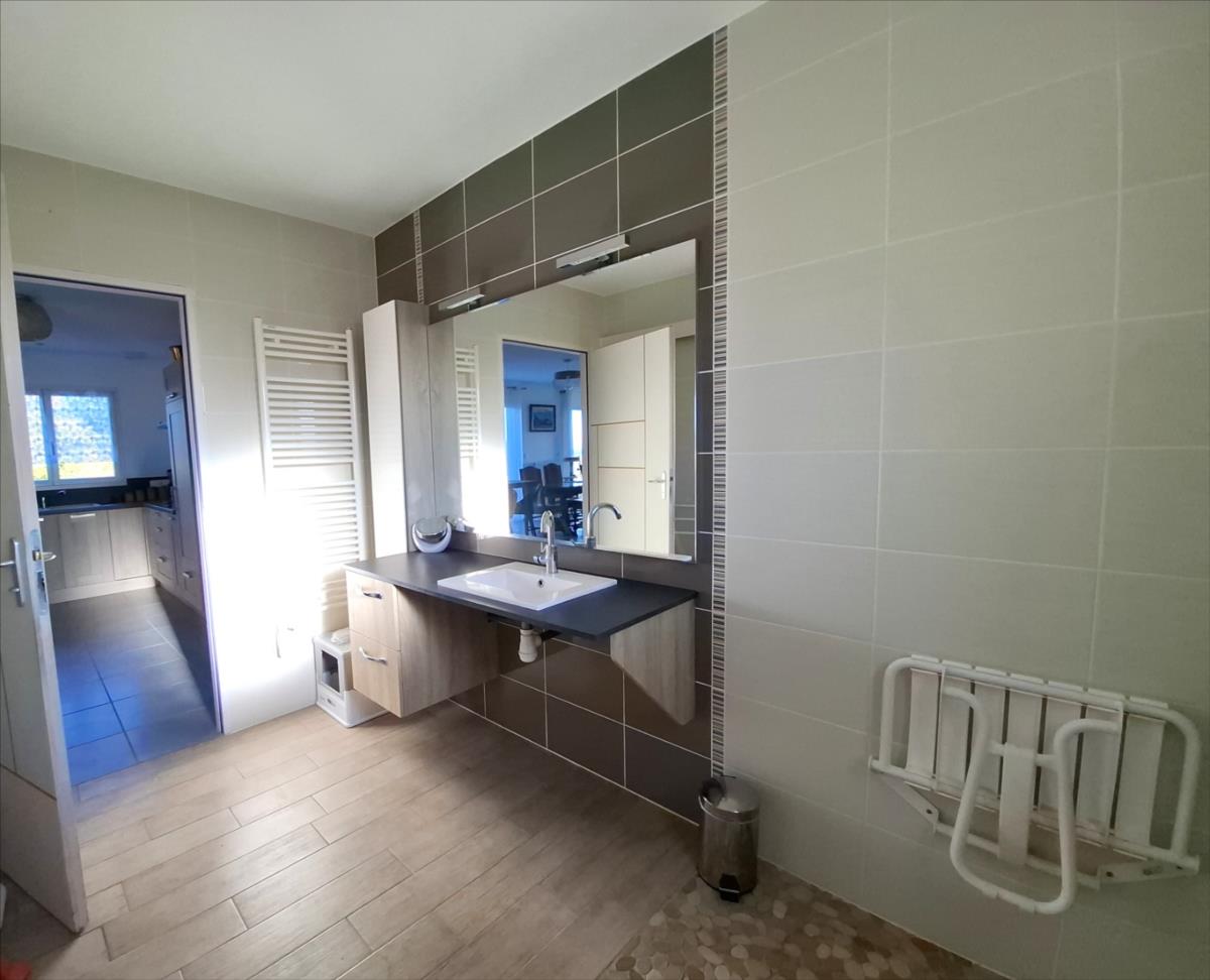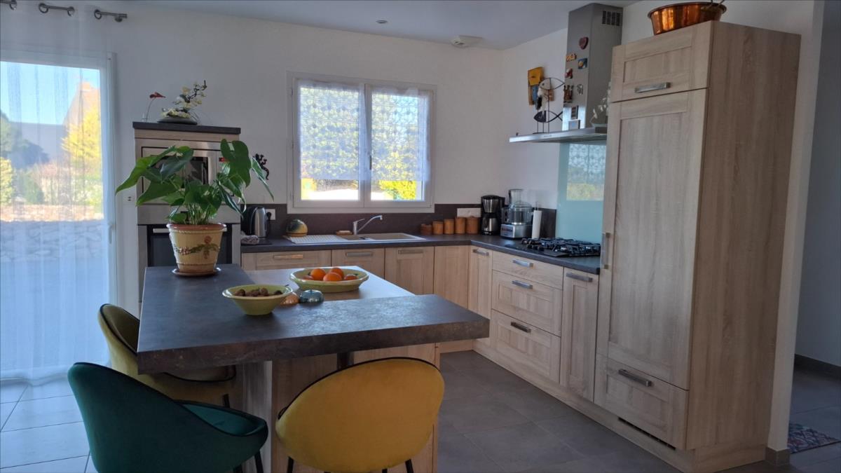 Avec une vue sur la mer, à 1.2 km de la plage et à moins de 5 kms des commercesPavillon de 2016, en parfait état, offrant une autonomie de plain-pied, composé de :. Au rez-de-chaussée : entrée desservant une belle pièce de vie (salle - salon) avec vue mer, cuisine ouverte aménagée et équipée, deux chambres, salle d'eau (douche à l'italienne), arrière-cuisine.. A l'étage : combles aménageables.Grand garage avec partie buanderie et grenier au dessus.Cour d'accès bitumée, jardin autour sur lequel cabanon de jardin.Pompe à chaleurCuve récupération eaux de pluie enterréeAspiration centraliséeAssainissement individuel conforme.