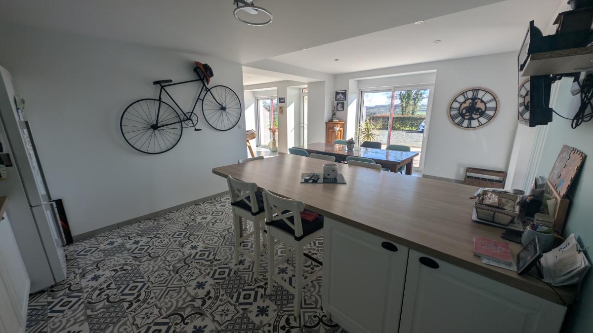 au rez-de-chaussée : séjour avec poêle à bois, cuisine ouverte aménagée/équipée, dégagement, wc, salle d'eau, garage.