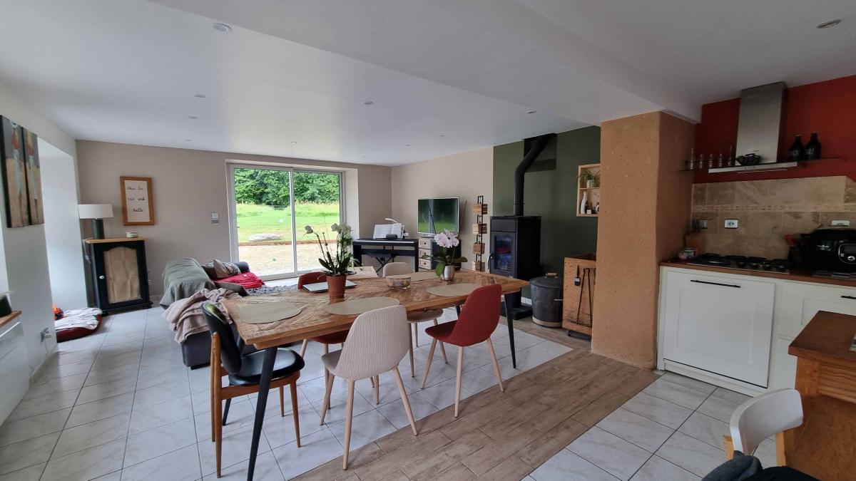 Au rez-de-chaussée : séjour/salon avec poêle à bois ouvert sur la cuisine aménagée et équipée, buanderie, wc.