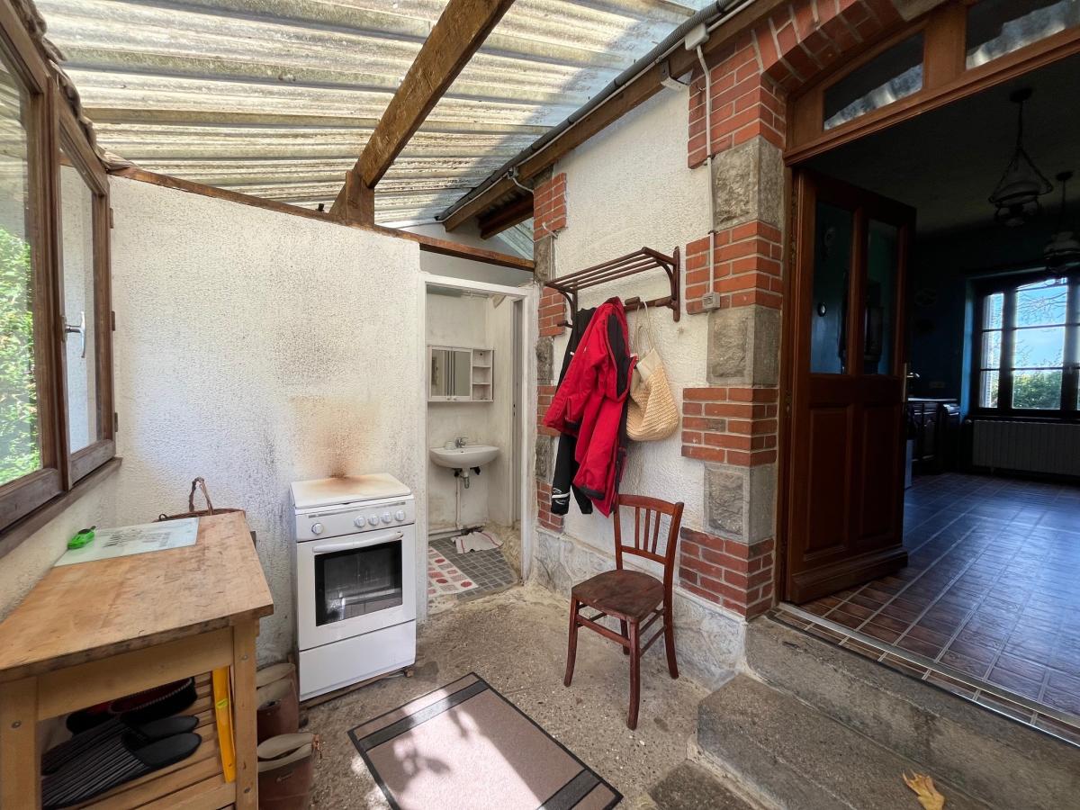 entrée, cuisine, véranda à la suite avec douche et wc, salon avec poêle à bois.
