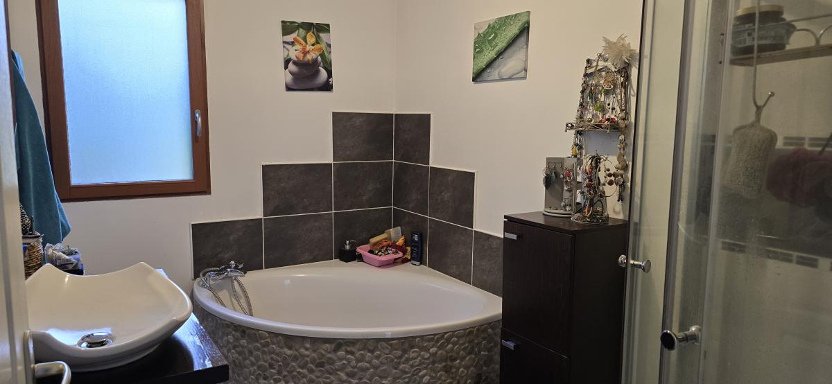 Au rez-de-chaussée : entrée, salon avec poêle à bois (avec réserve intégrée) et salle à manger, cuisine adjacente aménagée et équipée (lave-vaisselle, four, microonde, plaque de cuisson, hotte, élément de rangement), deux grandes chambres, salle de bain, wc.
