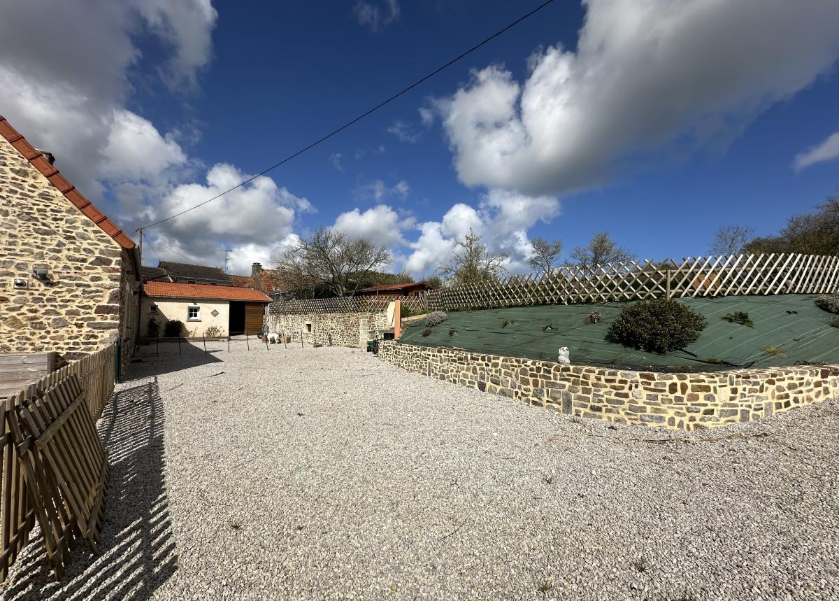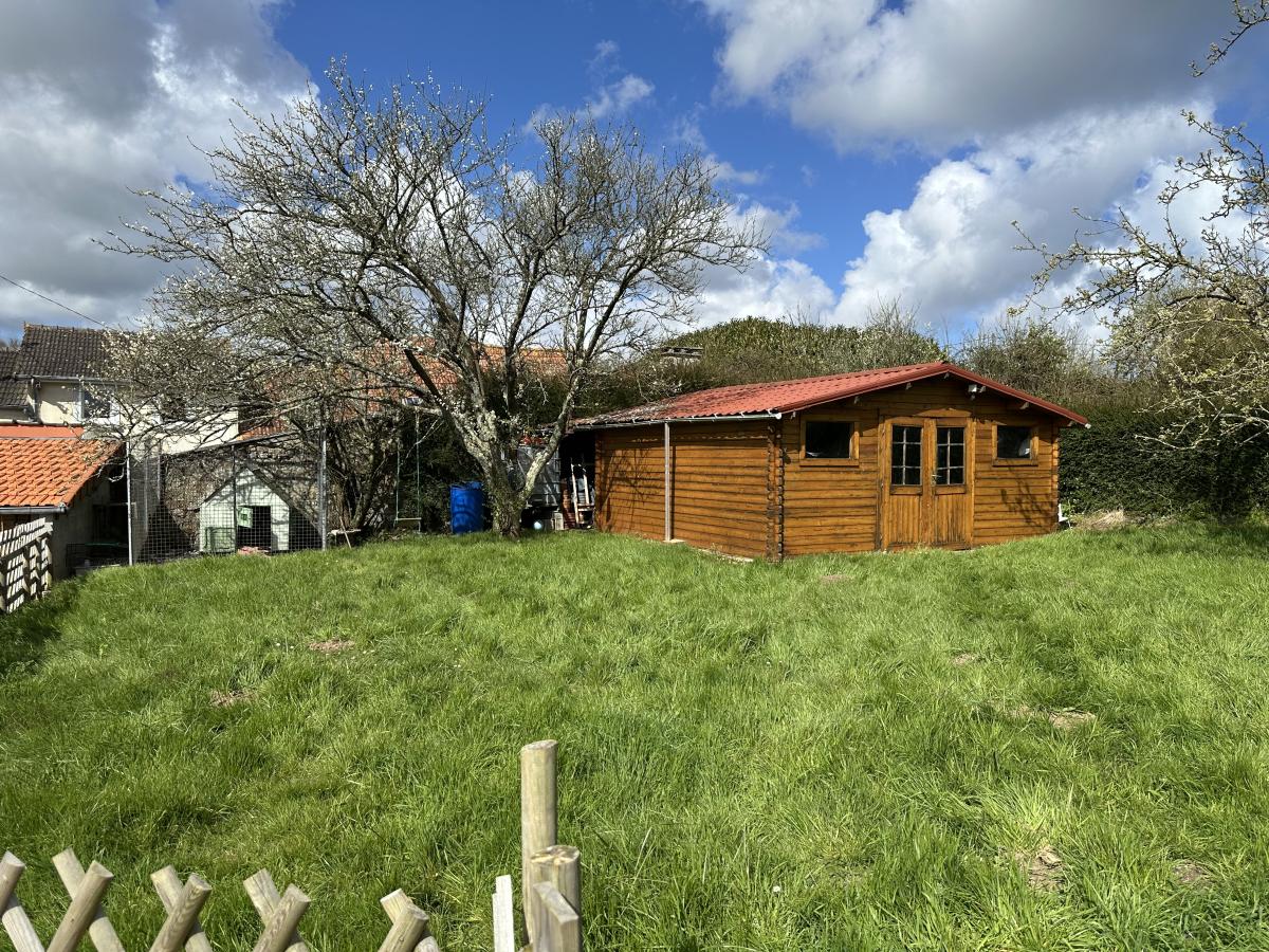 Sur l'arrière grande cour gravillonnée, barbecue, un abri bois attenant, un cabanon de jardin, terrain surélevé.