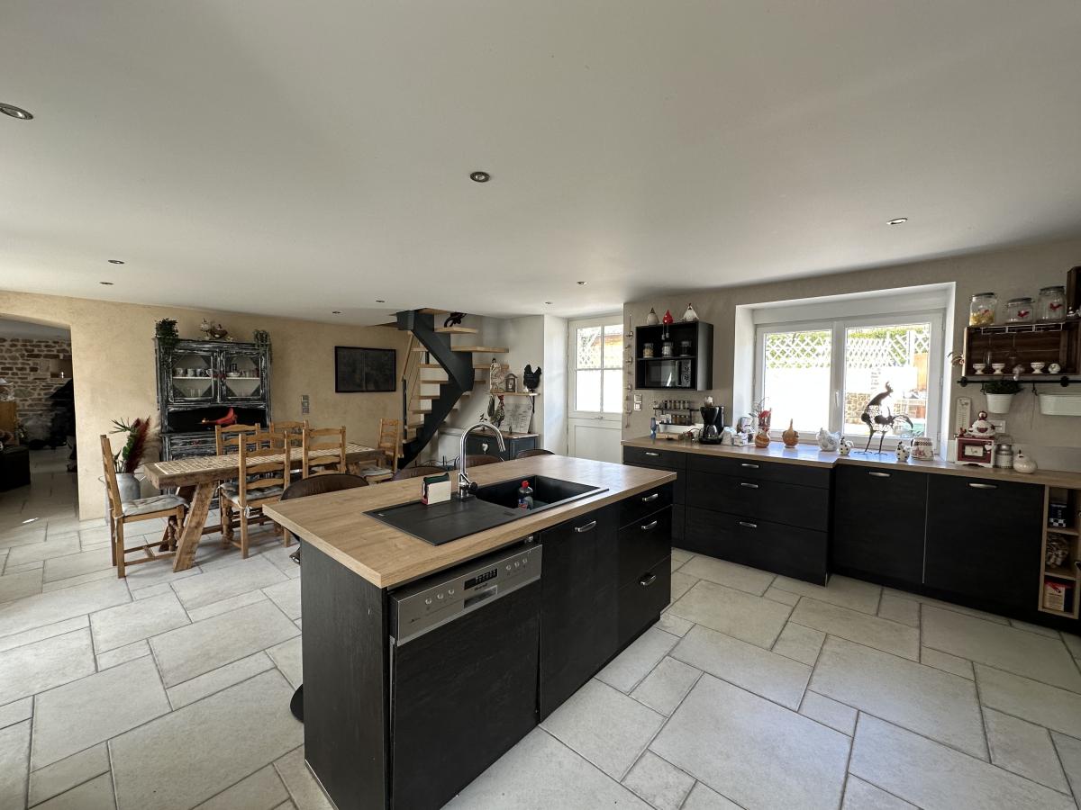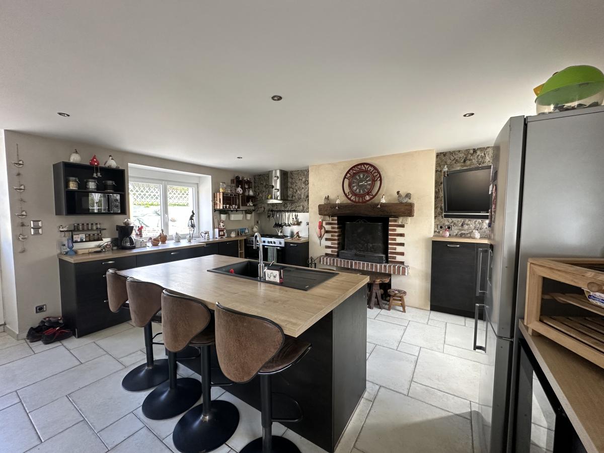 Elle vous offre au rez-de-chaussée : Une belle cuisine aménagée et équipée / salle à manger de 37m² avec cheminée, un salon/séjour de 38m² avec poêle à granulés.