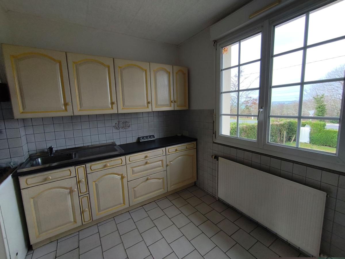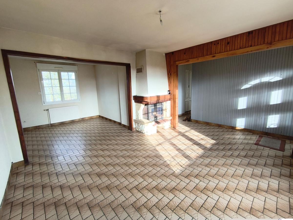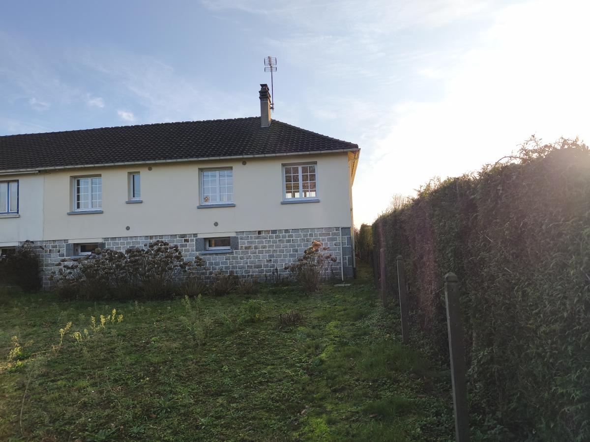 A proximité de Domfront, pavillon jumelé surélevé de 4 pièces principales avec hangar, sur env. 1ha 09 de terrain.