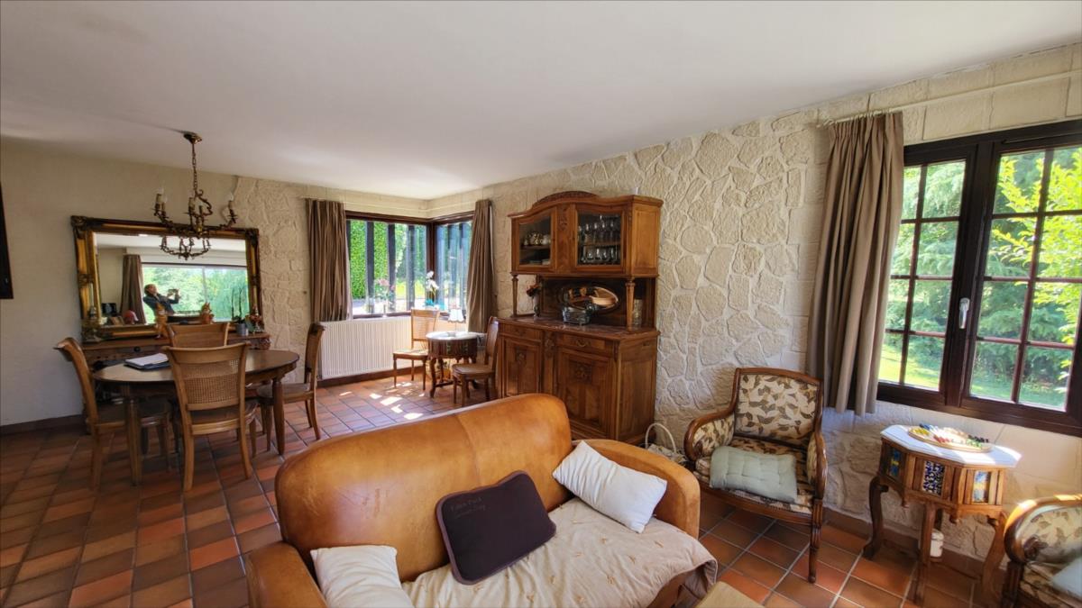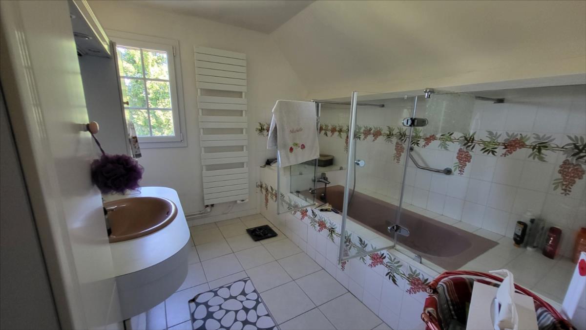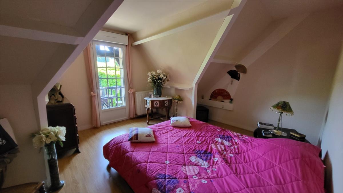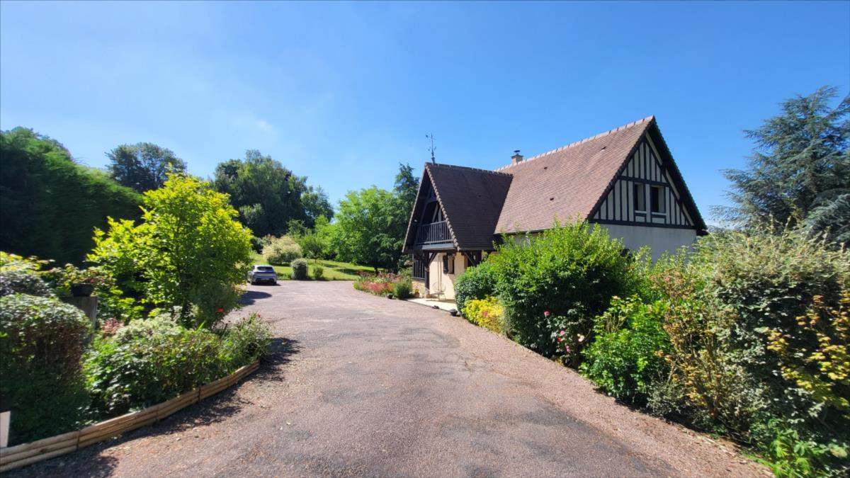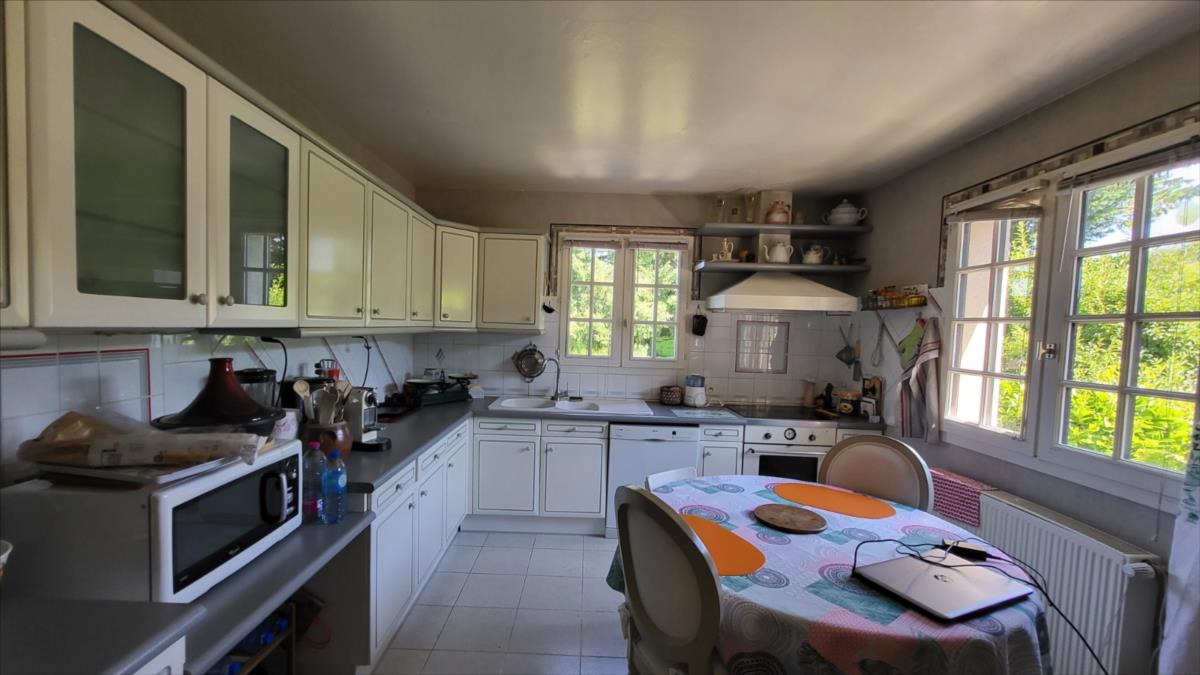 Dans un quartier au calme, à 1,5 km du centre ville de Vimoutiers, maison d'environ 133 m² bien entretenue comprenant : entrée avec placard-penderie, séjour avec baie vitrée donnant sur terrasse à l'extérieur et avec cheminée équipée d'un insert, cuisine aménagée et équipée (four, plaque de cuisson, hotte, lave-vaisselles), dégagement avec escalier desservant une salle de douche avec wc, une chambre ; à l'étage : couloir desservant trois chambres avec placard dont une avec balcon, salle de bains , wc séparés; sous-sol complet comprend partie garage, atelier, chaufferie et buanderie, avec adoucisseur d'eau, l'ensemble sur terrain arboré, avec source, allée goudronnée pour accès garage. Portail d'entrée électrique.