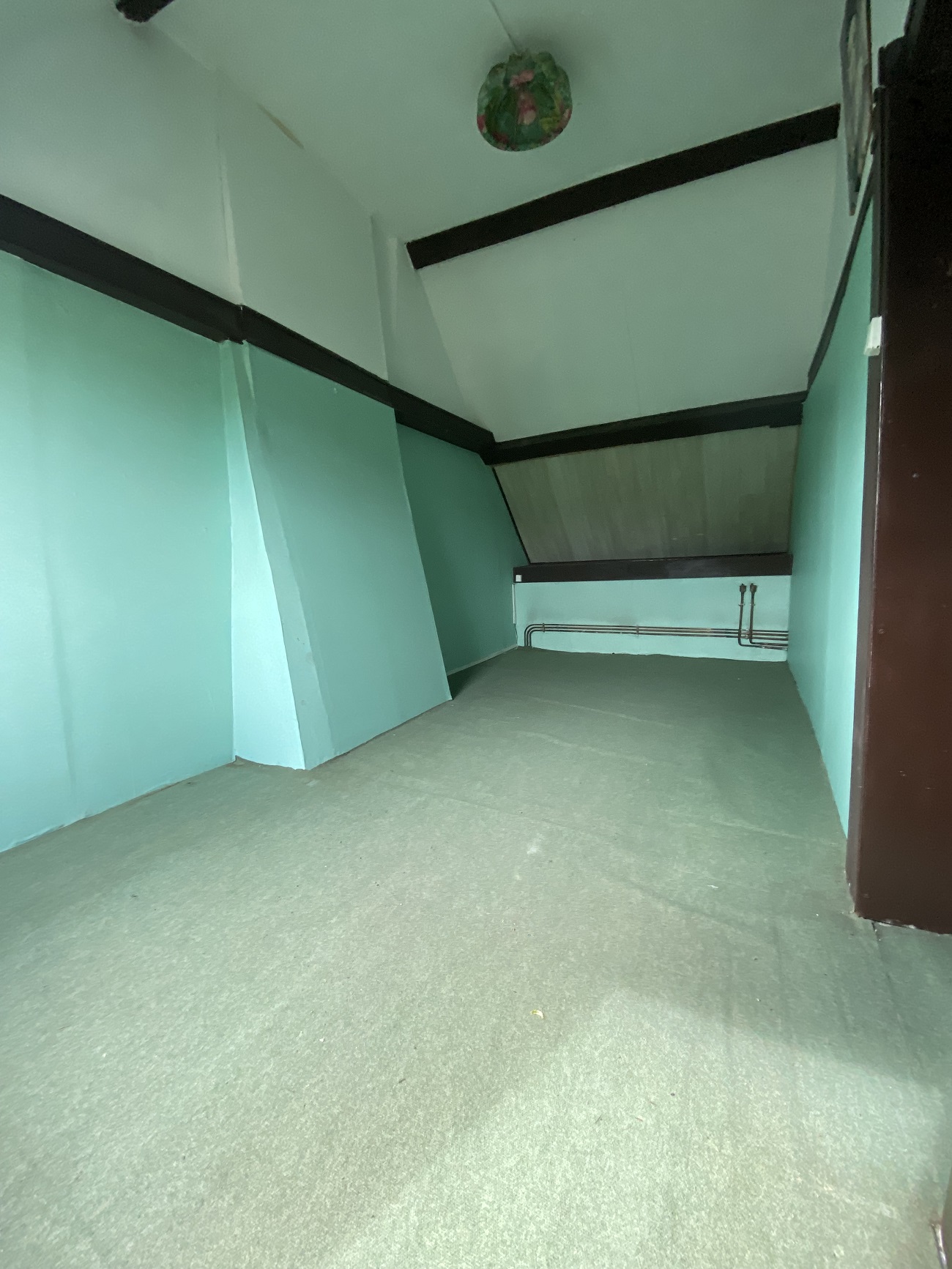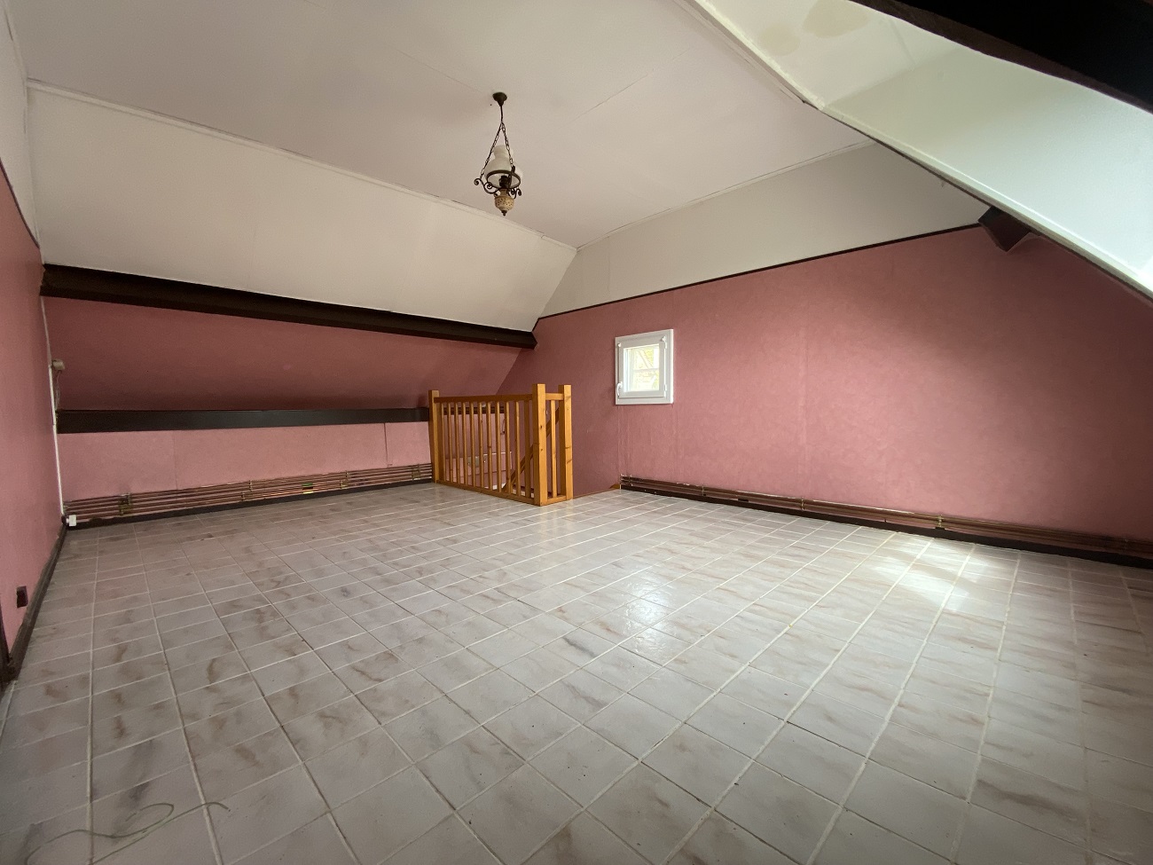 - Grand palier (4,142 m x 4,129 m) avec une fenêtre donnant sur le jardin à l’avant de la maison, petite fenêtre donnant sur le côté de la maison, toiture partiellement mansardée et radiateur.