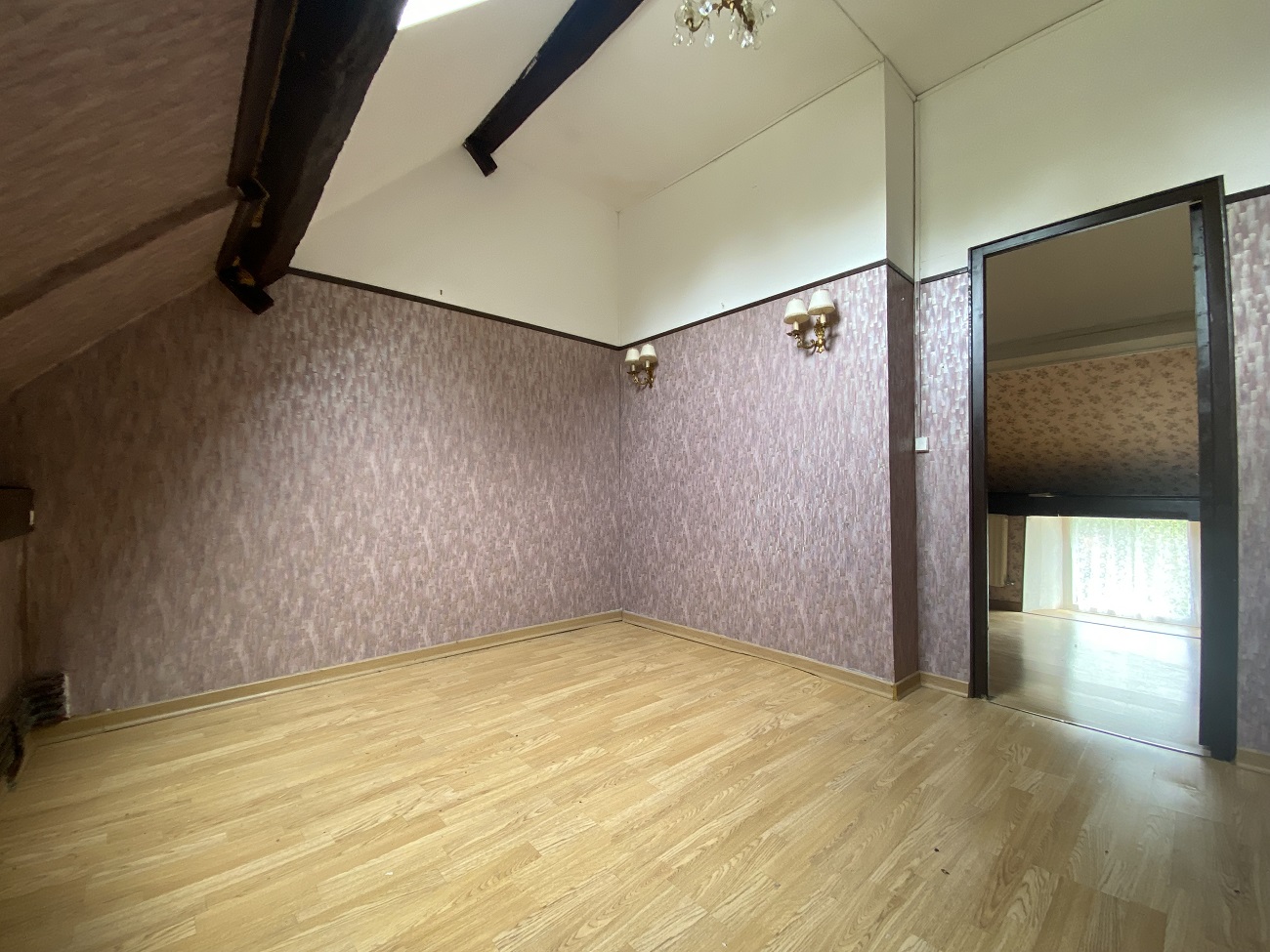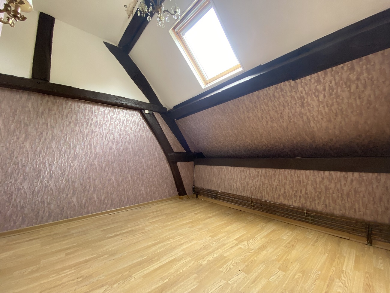 - Couloir desservant trois chambres (6,127 m x 0,937 m) avec petite fenêtre donnant sur le jardin à l’avant de la maison, toiture partiellement mansardée, radiateur, parquet flottant au sol.