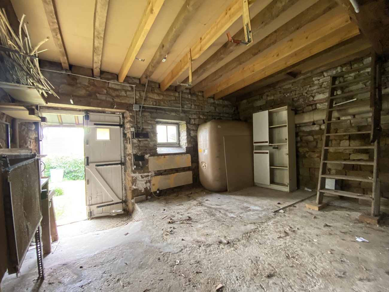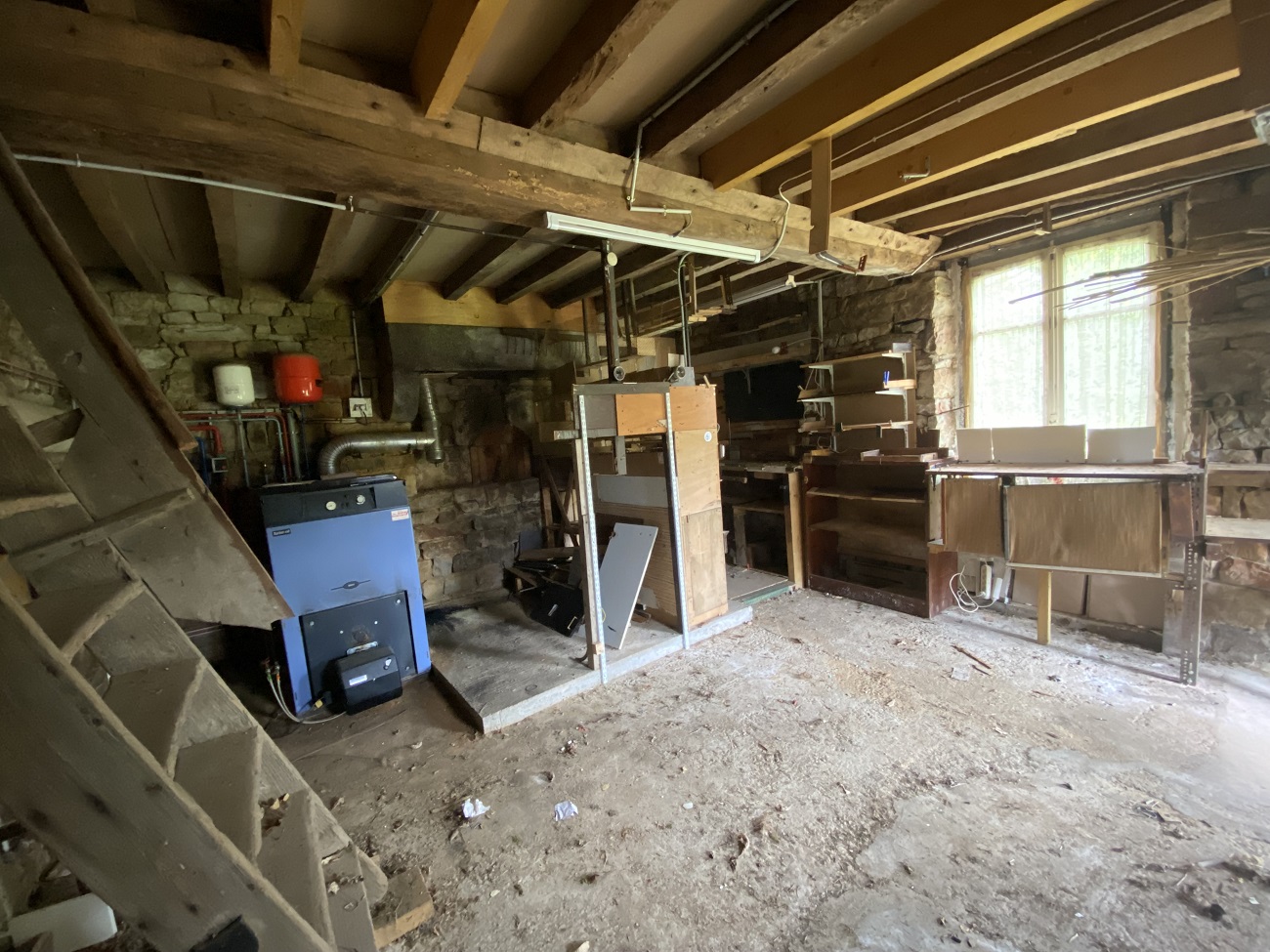 Atelier (5,364 m x 4,785 m) – accès au four à pains, chaudière, cuve à fuel, radiateur, fenêtre donnant sur le côte de la maison et porte.