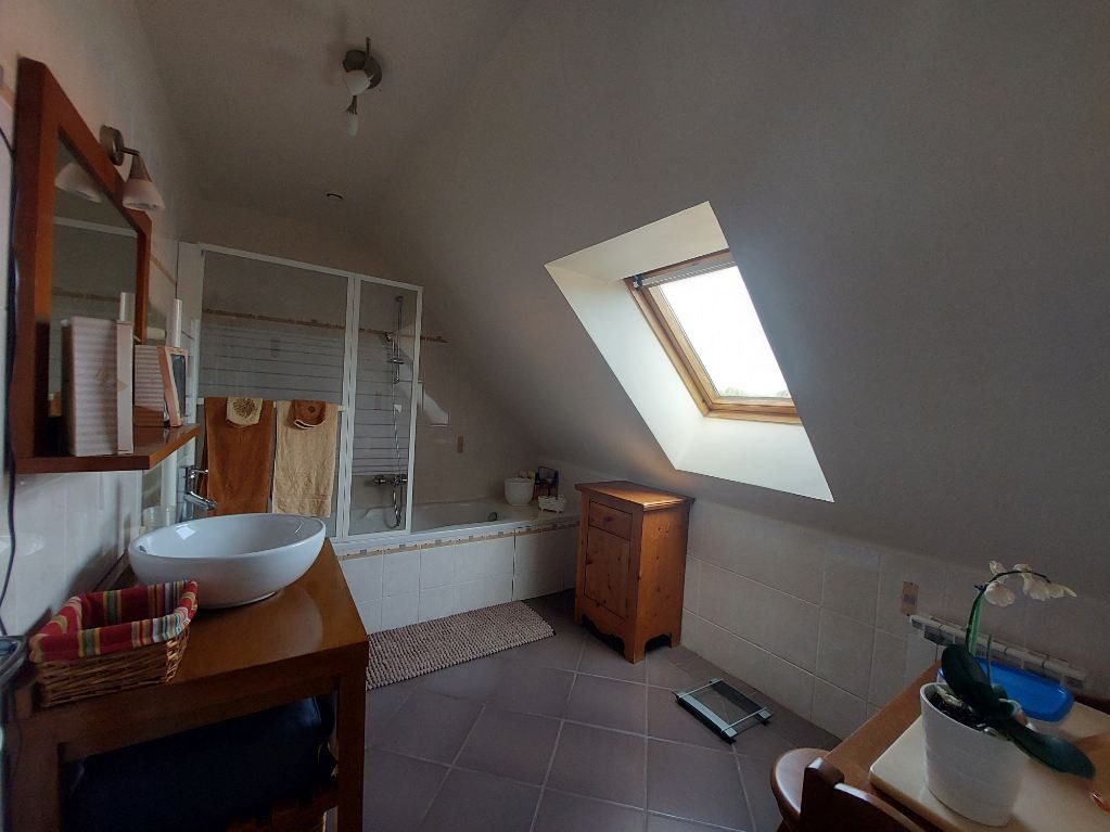 À l'étage, une grande pièce (mezzanine) desservant deux chambres, un dressing et placards de rangement complètent cet étage ainsi qu'une salle de bains et un wc.