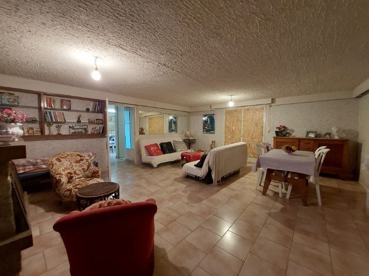 Maison sur sous sol surélevé comprenant au rez de jardin, un garage, buanderie, cuisine, salle de bains avec un wc, une pièce avec une cheminée, une chambre.