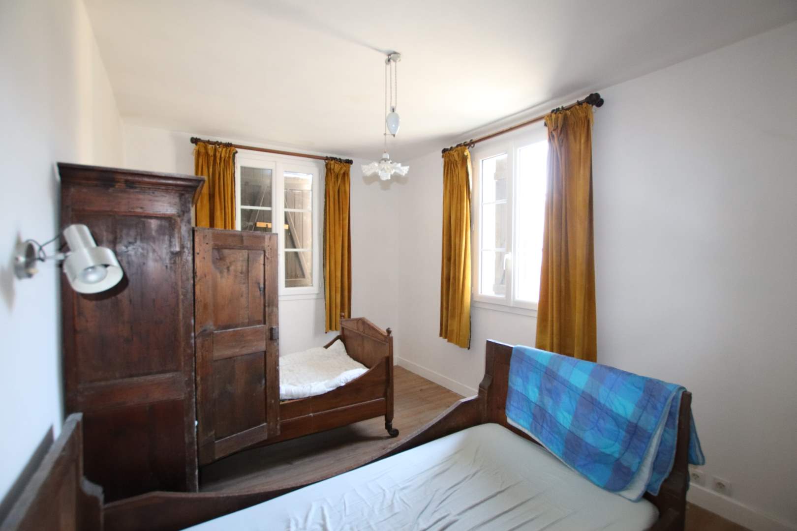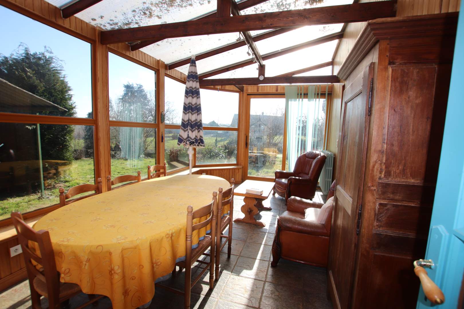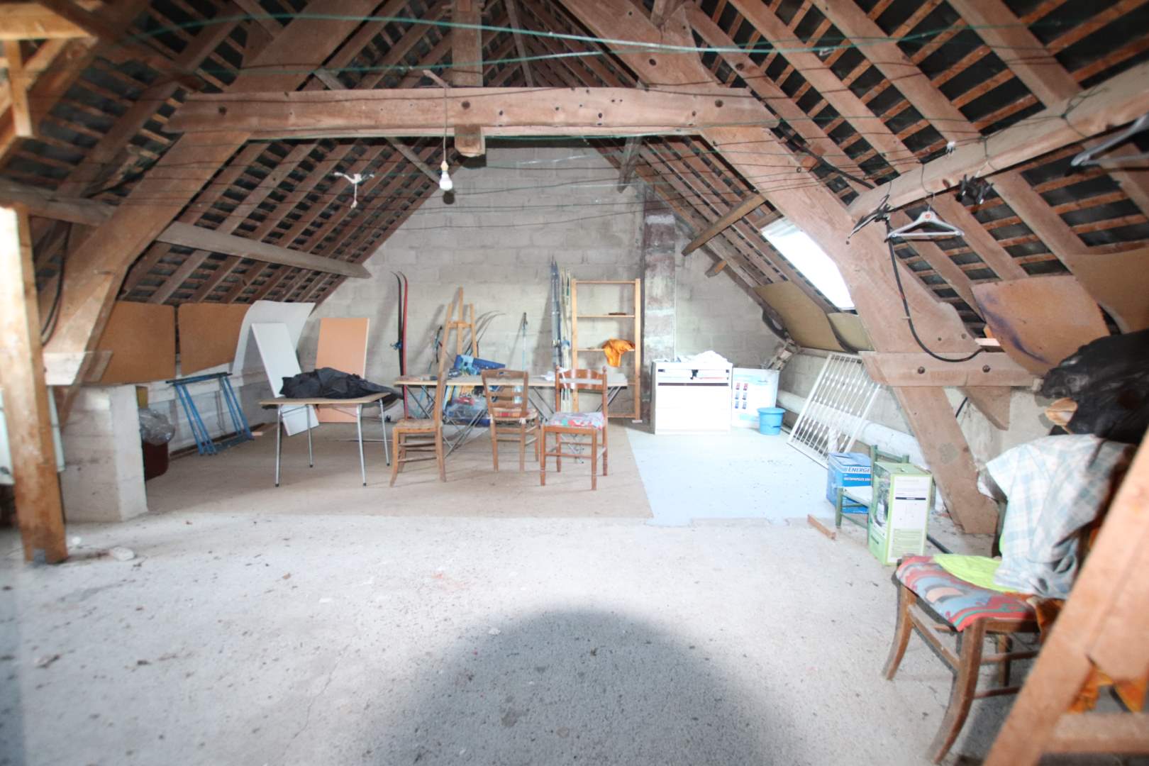 Une maison composée au rez-de-chaussée : entrée, un bureau, salon, véranda, cuisine, salle d'eau, WC, une chambre, un garage, à l'étage : deux chambres, salle de bains, un grenier. En face, autre garage avec partie atelier et un grenier aménageable., Terrain.