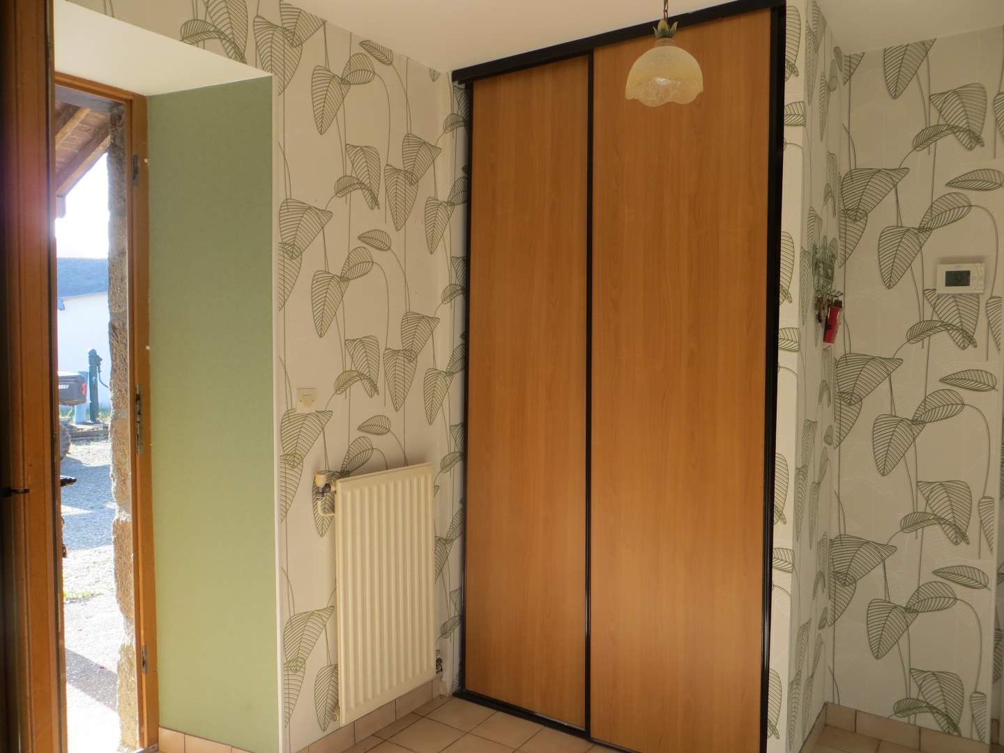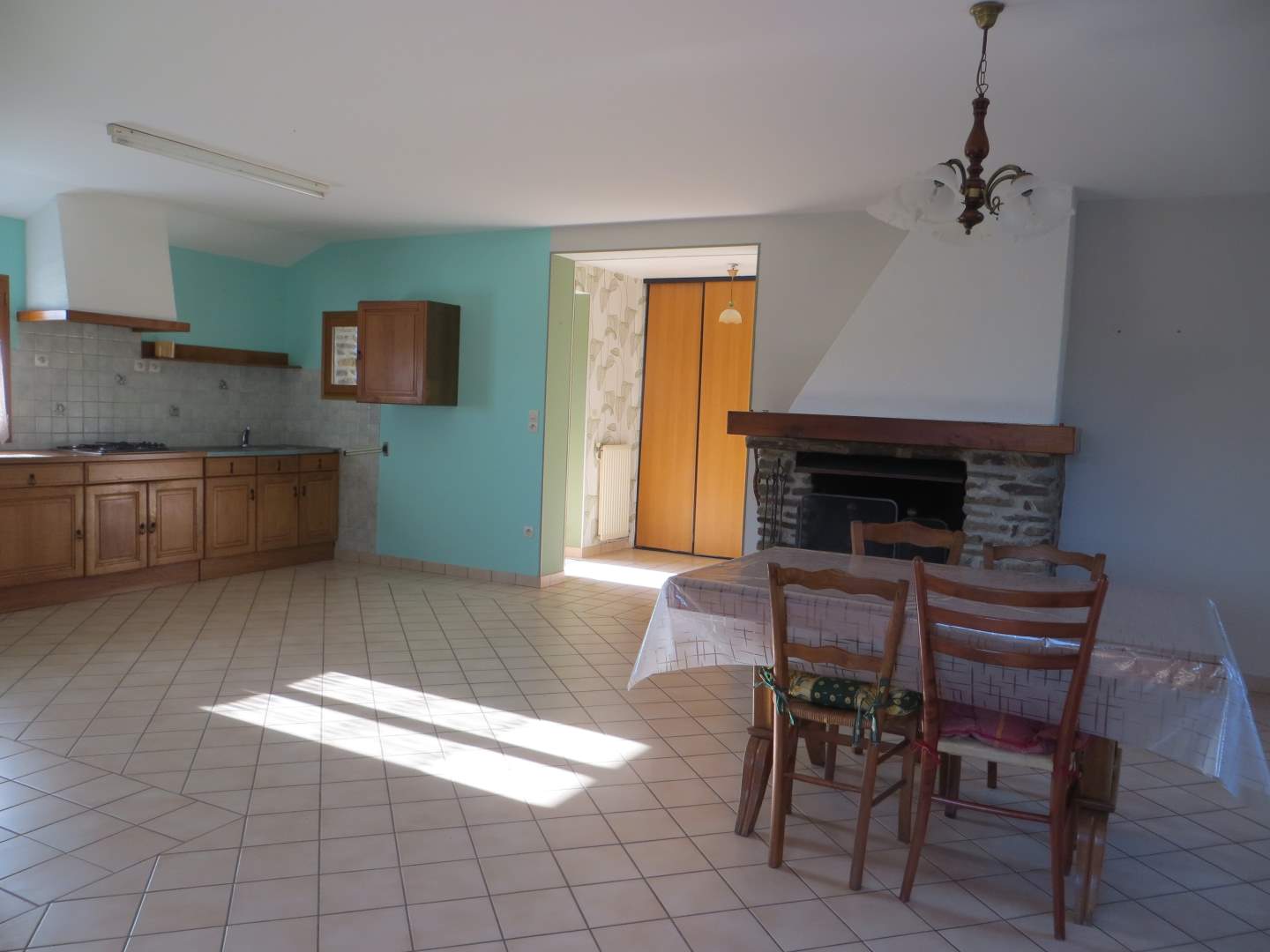 En rez de chaussée : entrée avec placards, cuisine ouverte sur salle à manger/salon, une chambre , salle d’eau, wc, autre chambre.
