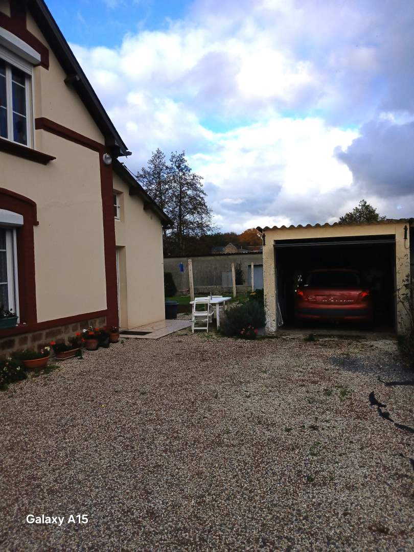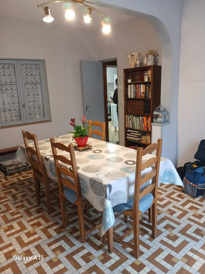 Une maison comprenant : Au rez-de-chaussée : salle à manger et salon, une cuisine, salle de bains et wc. A l’étage : 3 chambres. Garage. 2 bâtiments au fond du jardin