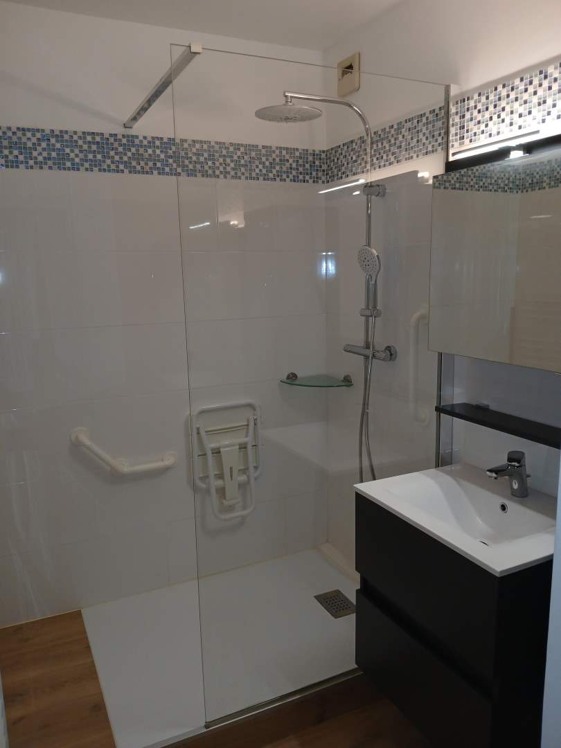Entrée et couloir avec placards, cuisine aménagée, salle à manger et salon, deux chambres, salle d’eau avec douche à l’italienne,wc. Balcon.