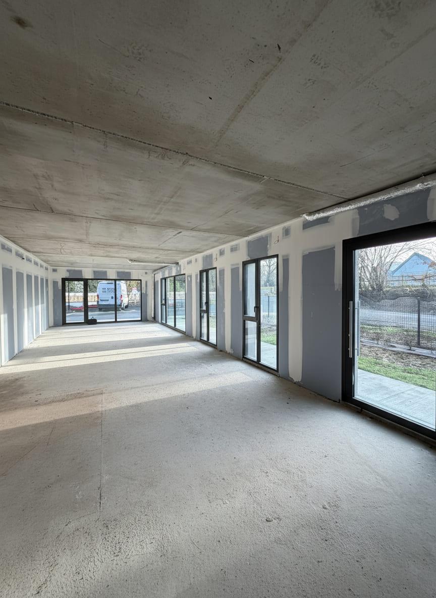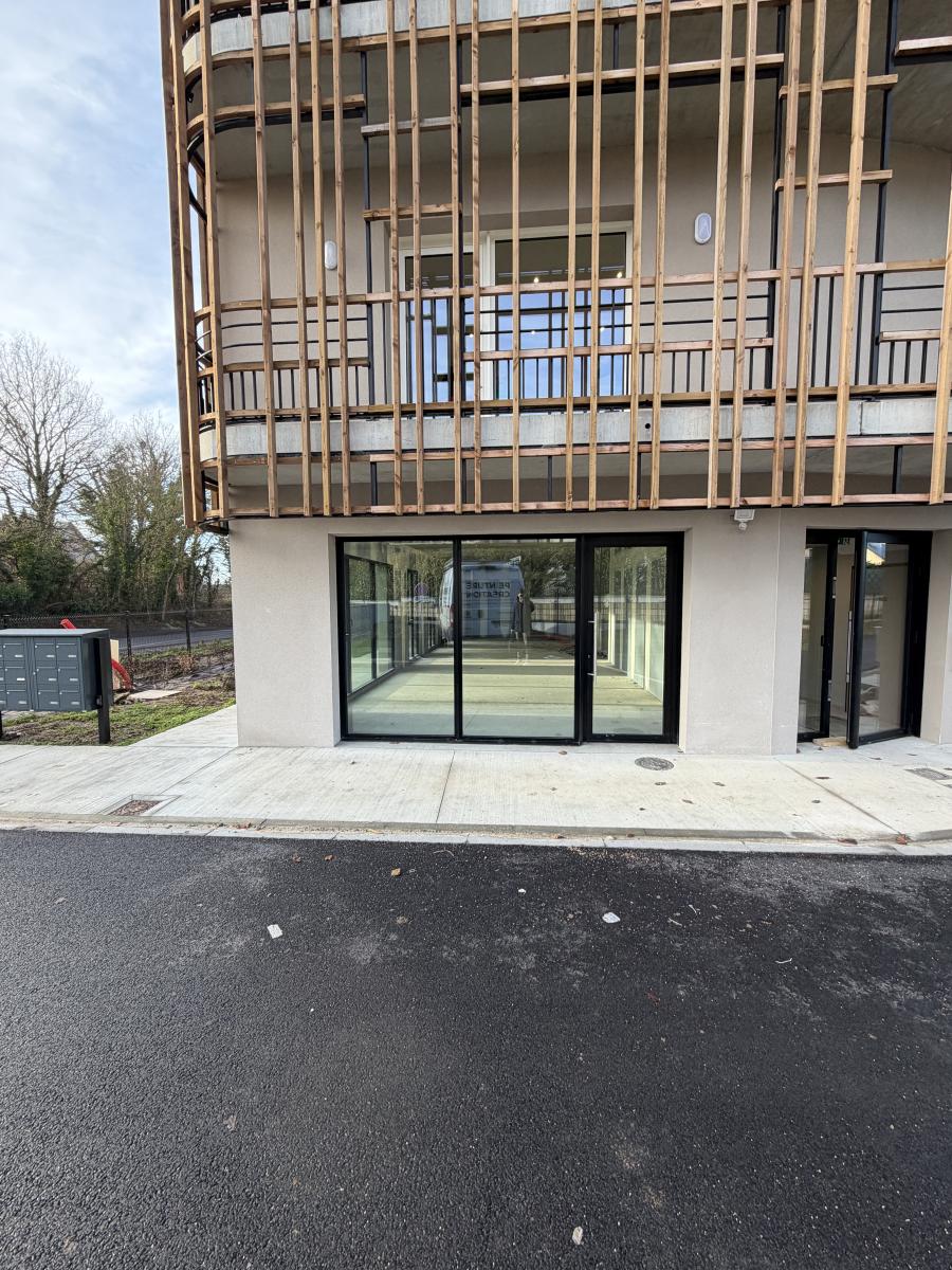 Au rez-de-chaussée d’un ensemble immobilier neuf en copropriété, local commercial de 78 m², livré brut de béton, fluides en attente et vitrine posée.