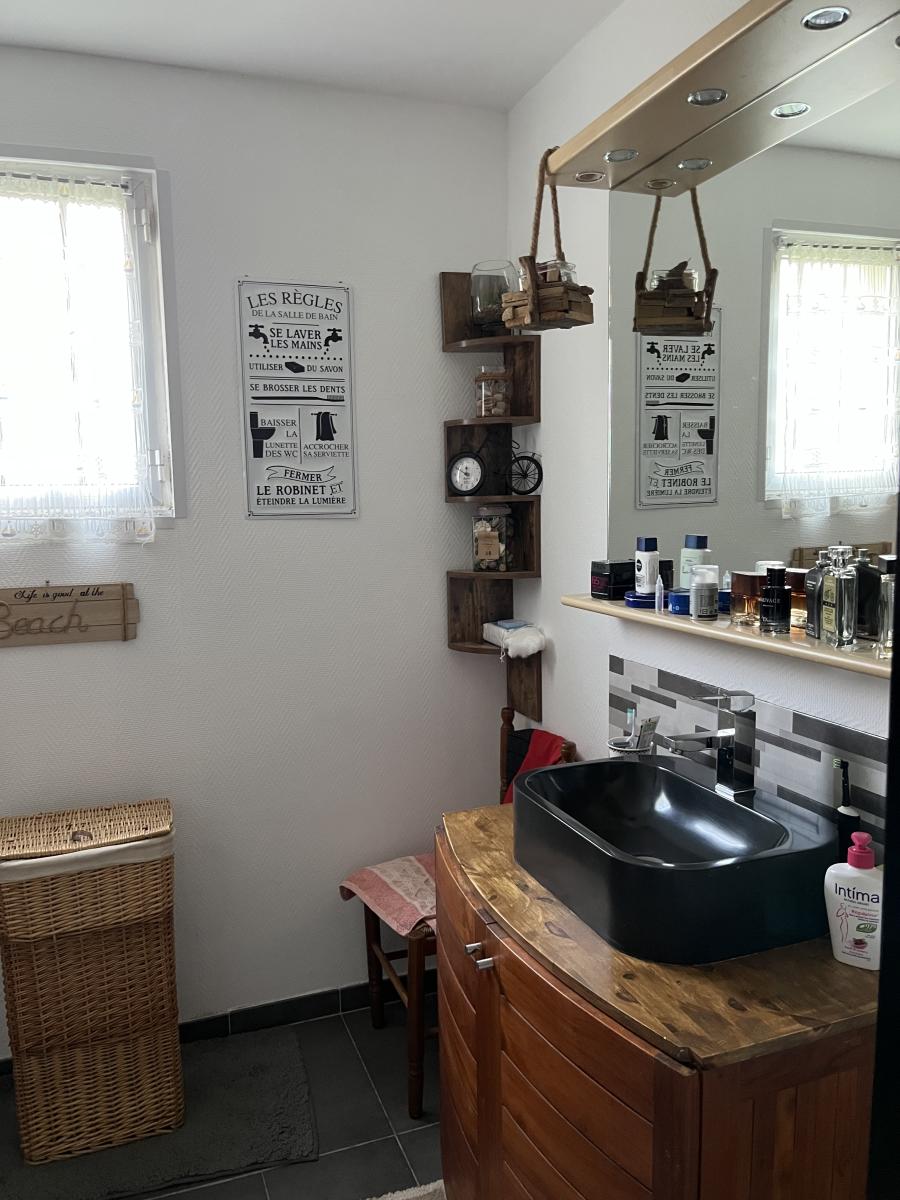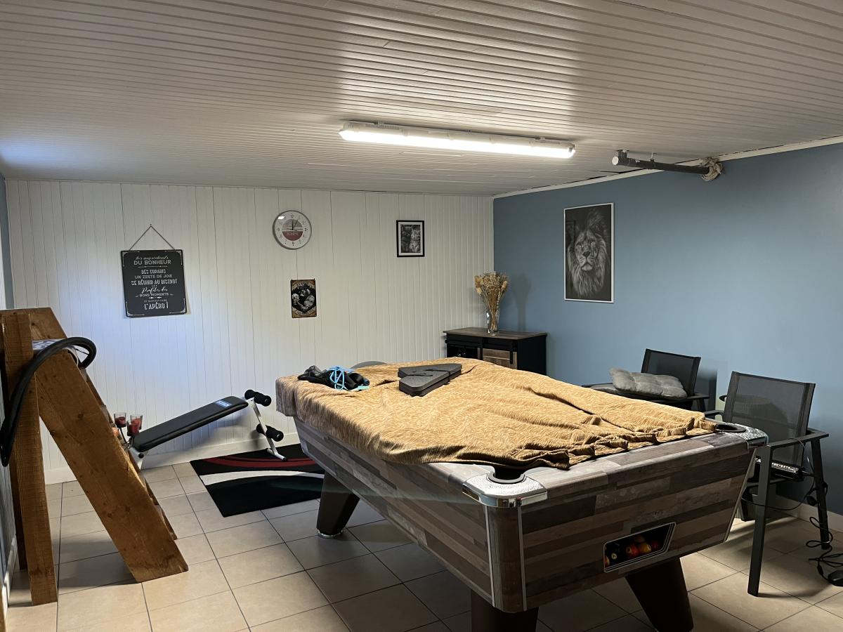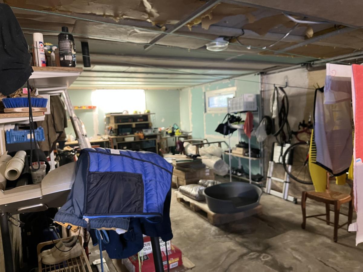 Dozulé, sur 1180m² de jardin au calme, maison édifiée sur sous-sol complet (garage, atelier, une grande pièce), maison comprenant : séjour salon avec poêle à granulés, cuisine ouverte aménagée, bureau, une chambre, salle de douche, wc. A l'étage : dégagement, deux chambres dont une avec espace dressing.
