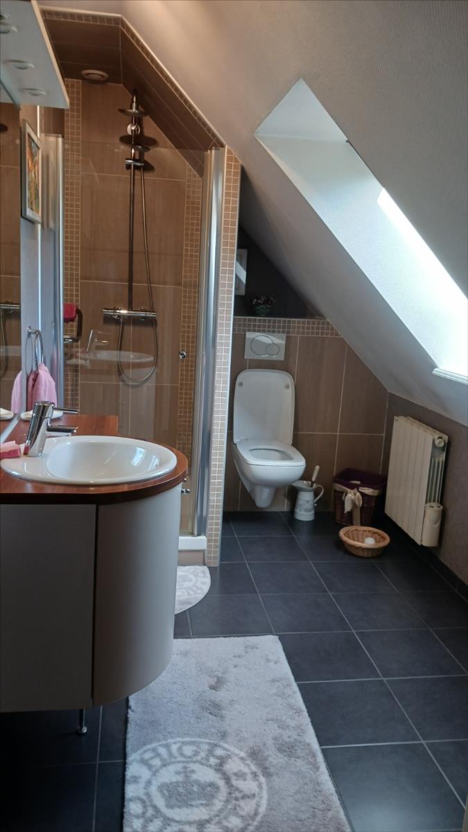 - à l'étage : pièce palière, deux chambres, salle d'eau avec WC, grenier offrant des possibilités pour créer une chambre supplémentaire.