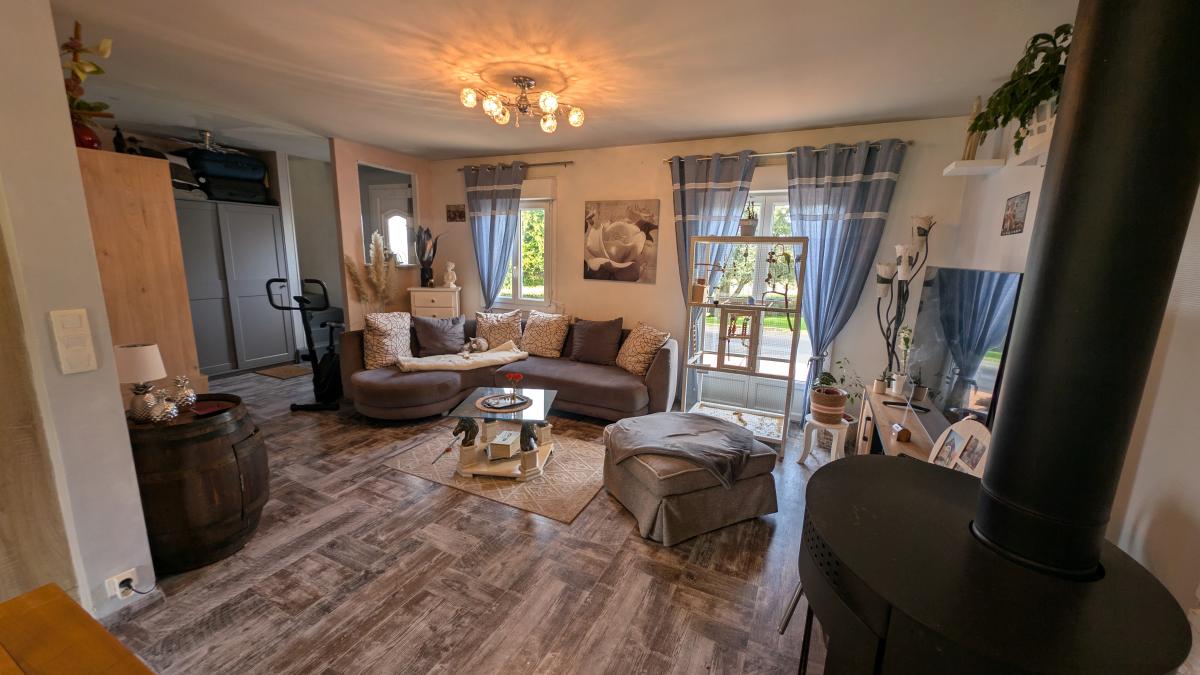 Au rez-de-chaussée : entrée ouverte, séjour avec cuisine ouverte et poêle à bois, dégagement desservant deux chambres, salle d'eau et wc,