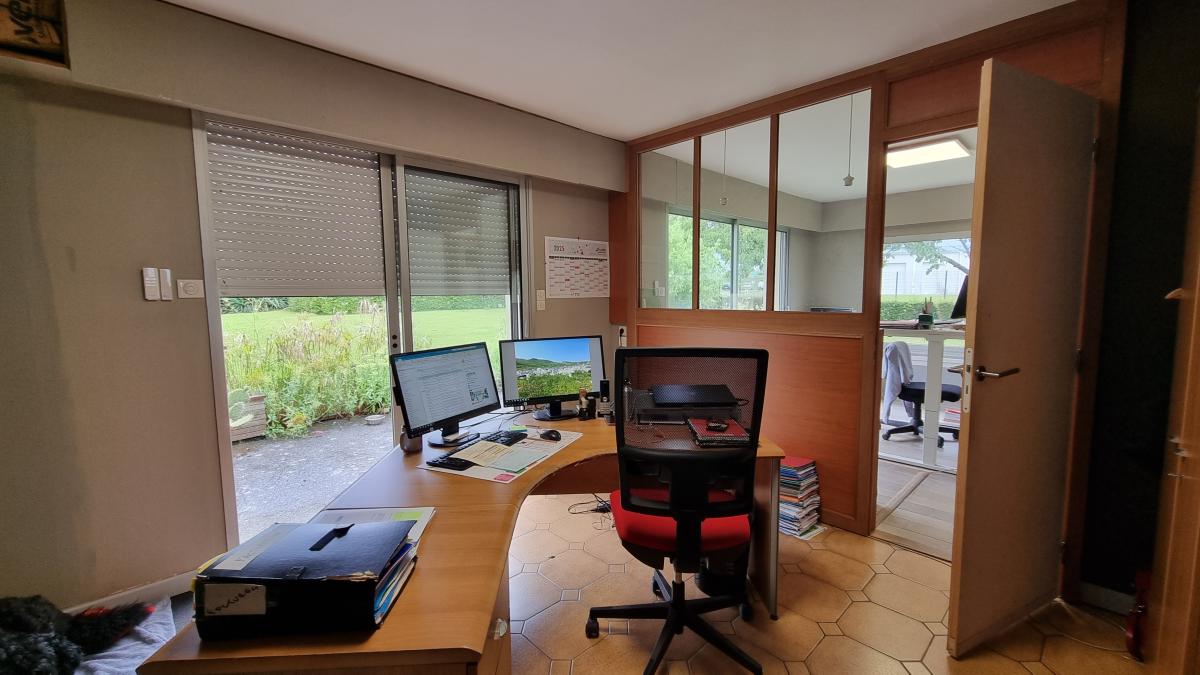 Au rez-de-chaussée : entrée avec escalier, un grand bureau, deux autres bureaux, couloir desservant un bureau avec ancienne salle d'eau, buanderie, wc.