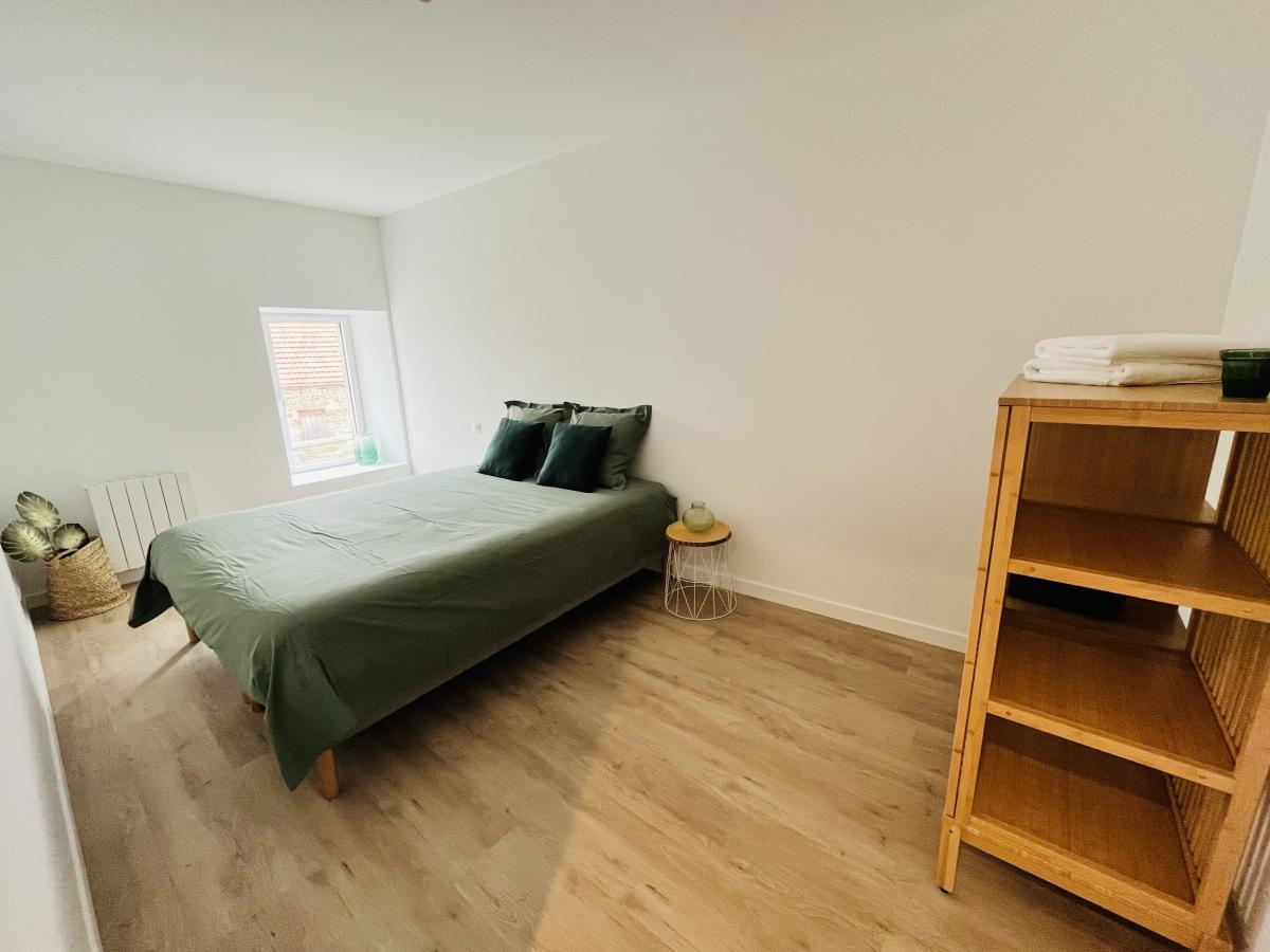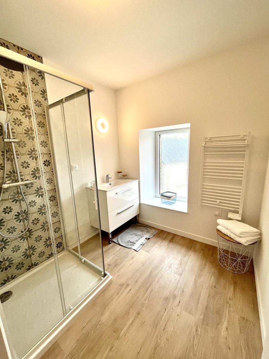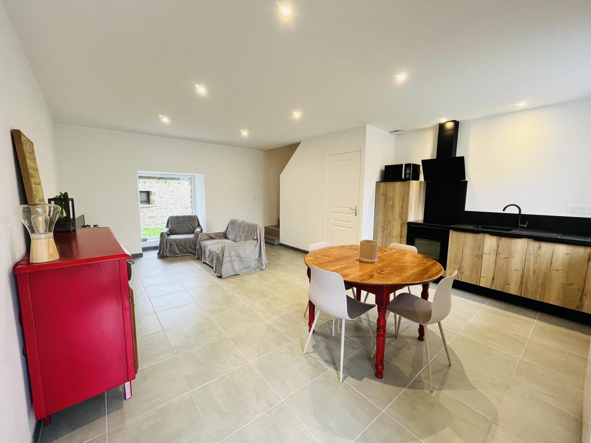 4°) Dernier logement non mitoyen de 82 m² comprenant: entrée avec placard, séjour avec cuisine ouverte équipée, WC, salle d’eau. A l’étage : palier, deux chambres. Garage avec évier, petit jardin clos de murs sur l’arrière avec terrasse carrelée.