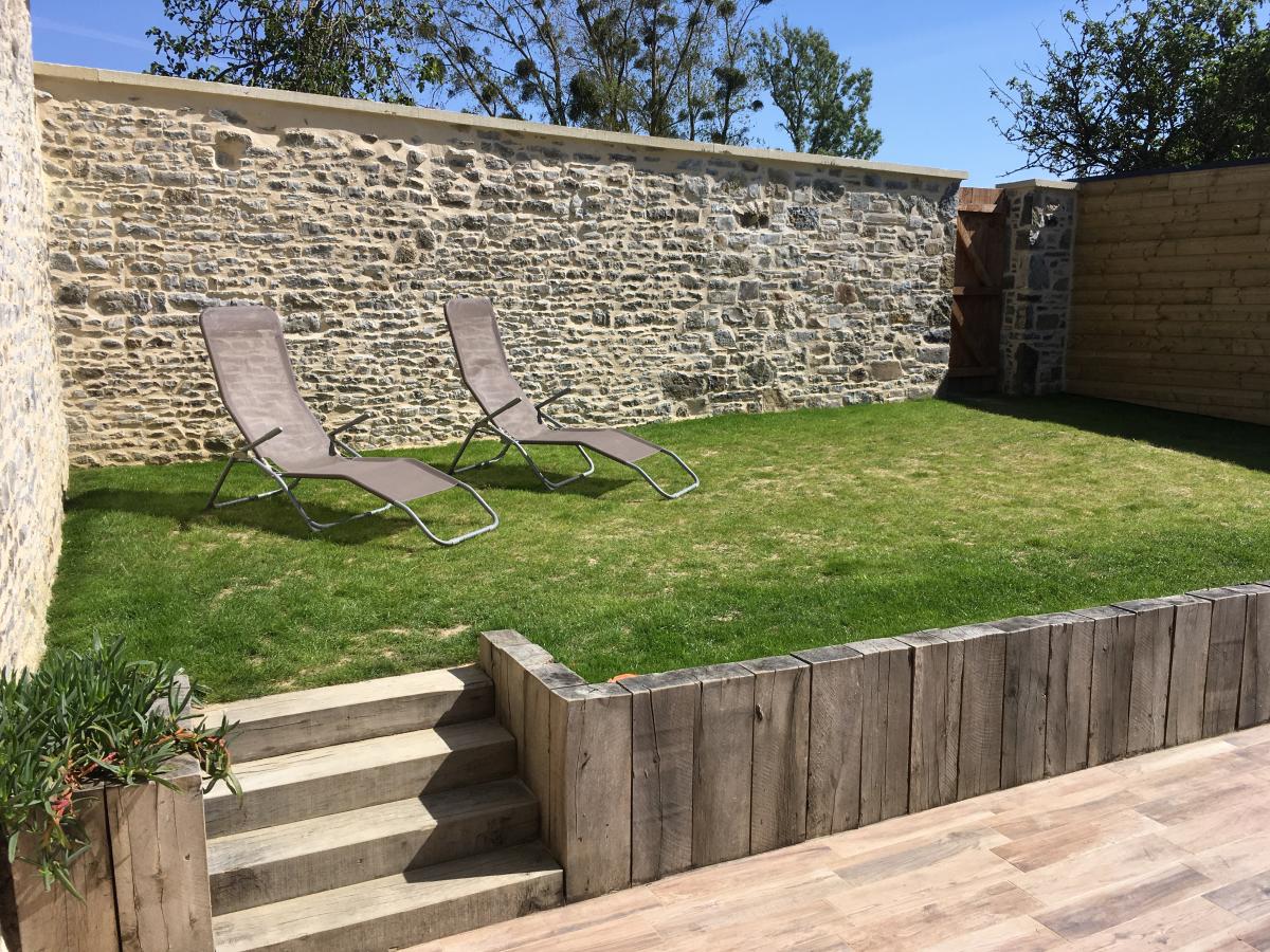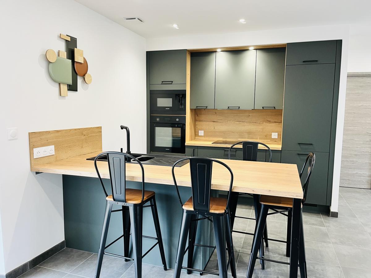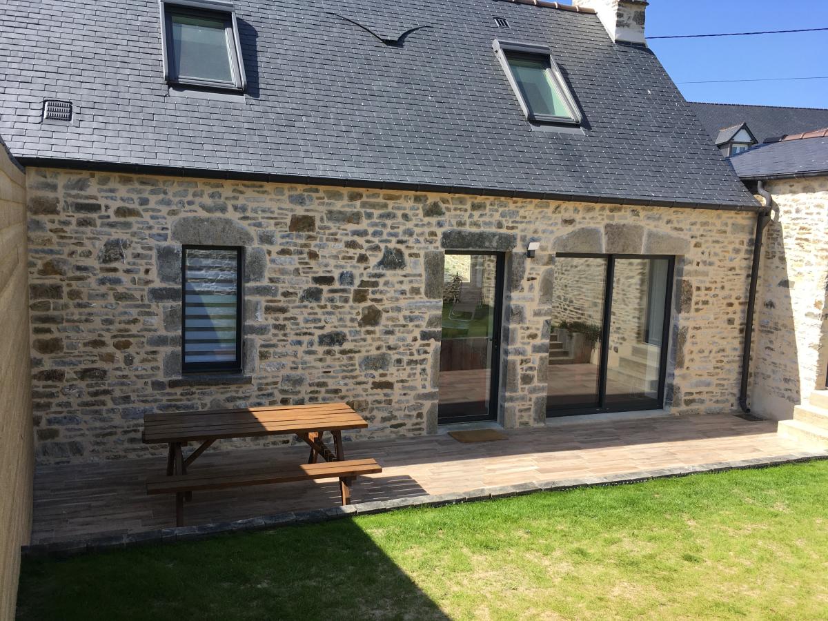 4°) Dernier logement non mitoyen de 82 m² comprenant: entrée avec placard, séjour avec cuisine ouverte équipée, WC, salle d’eau. A l’étage : palier, deux chambres. Garage avec évier, petit jardin clos de murs sur l’arrière avec terrasse carrelée.