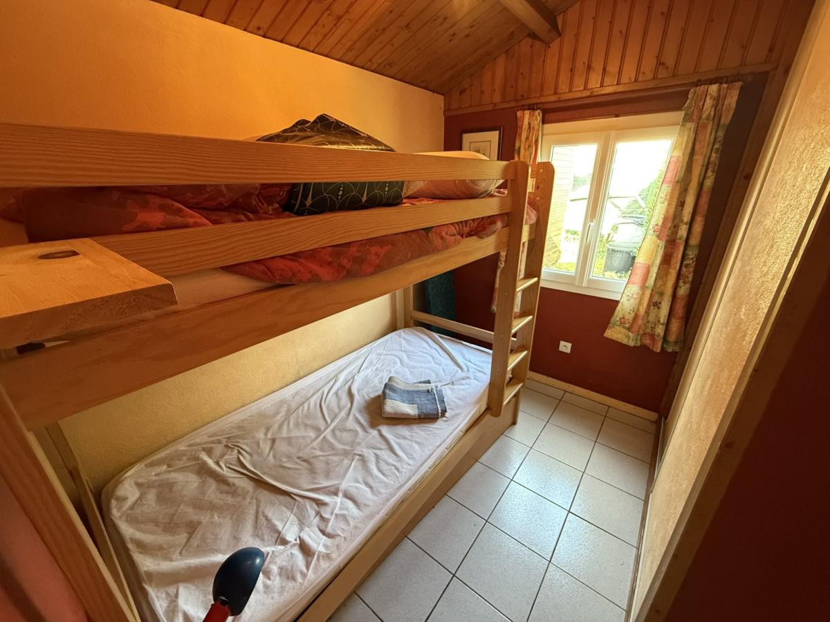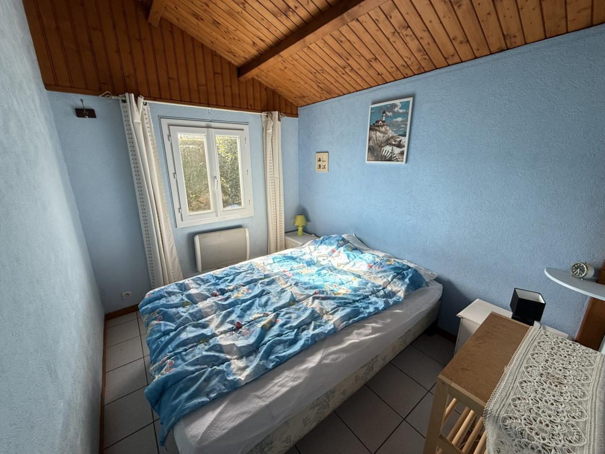 Cuisine équipée ouverte sur un séjour avec poêle à bois et placard, trois chambres dont une avec placard, WC, salle d'eau avec grande douche à l'italienne.