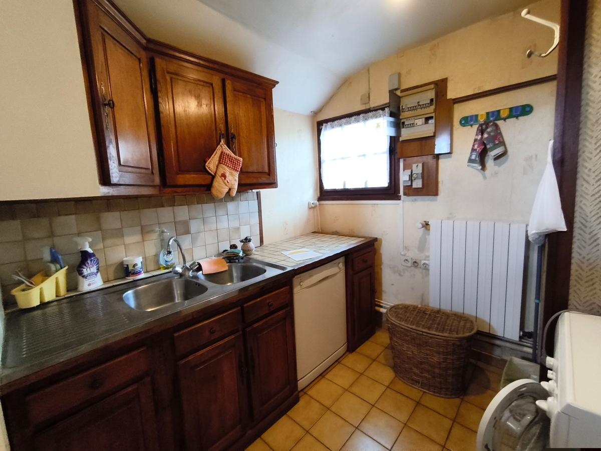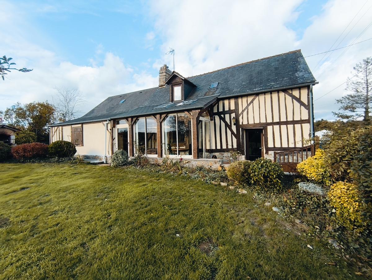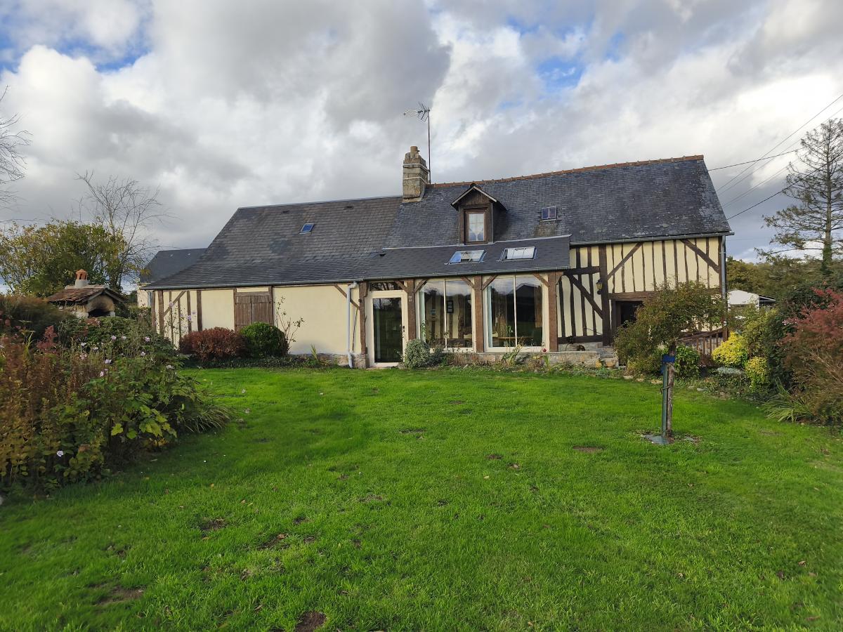 A proximité de Domfront, dans hameau en campagne, maison de 5 pièces principales et véranda, avec dépendances sur env. 2.000 m² de terrain.