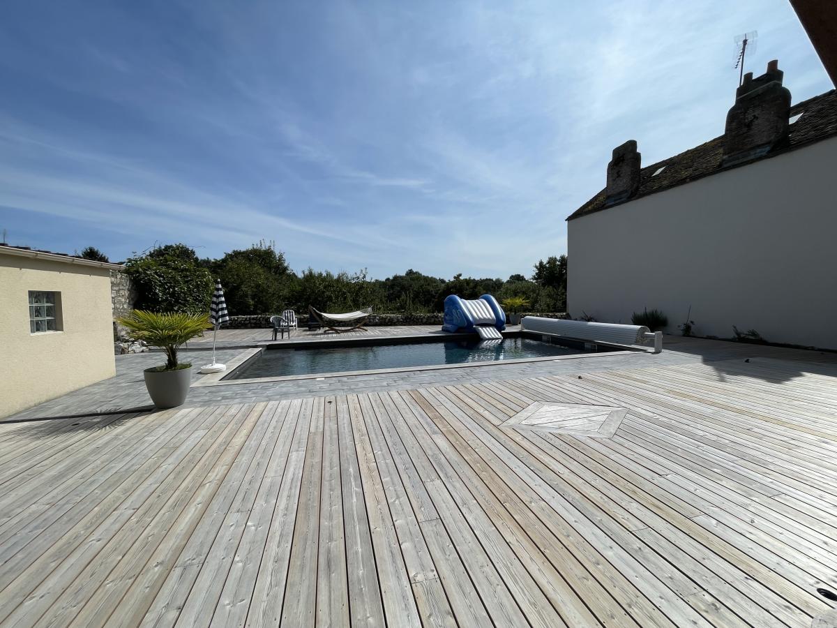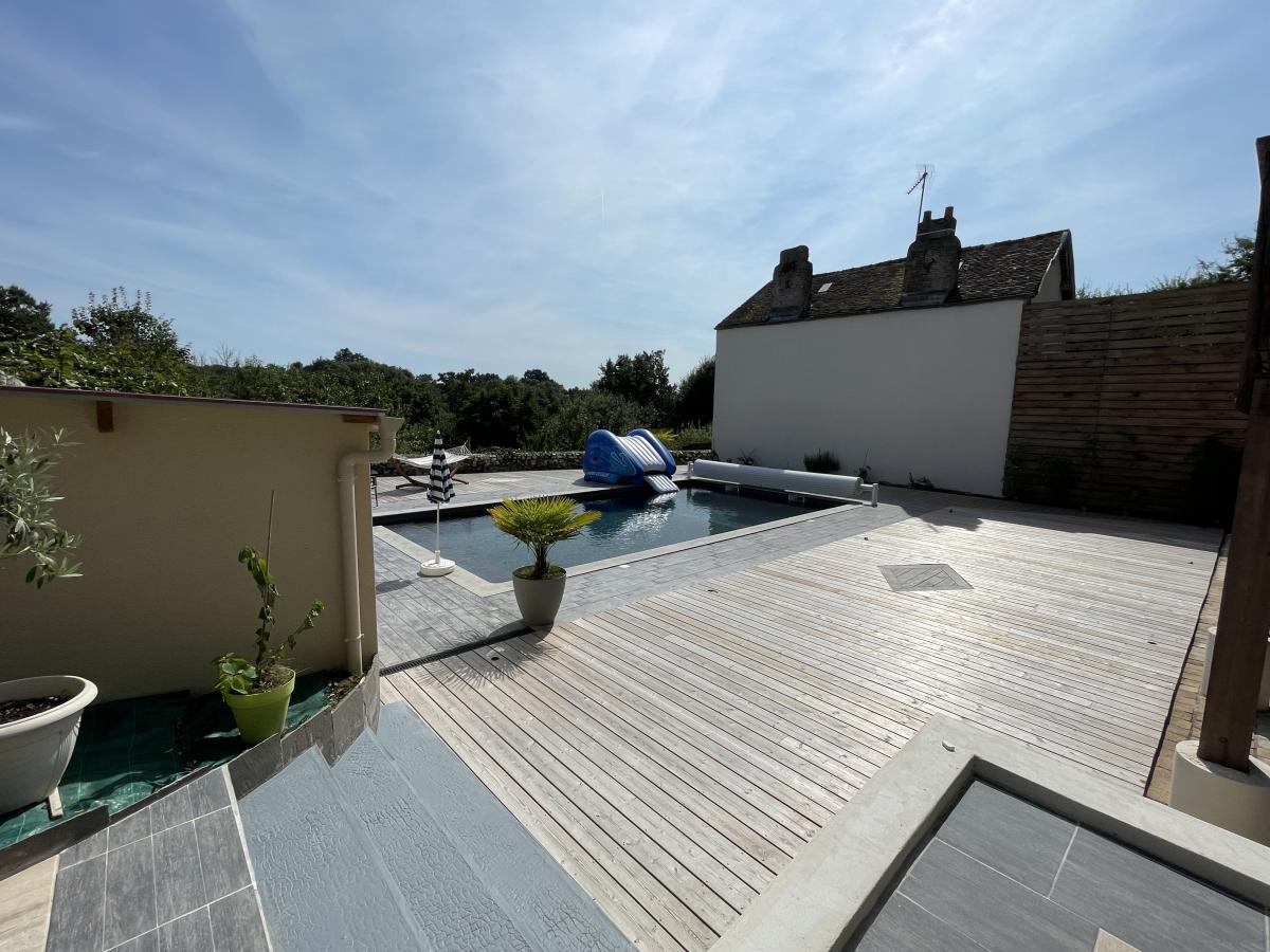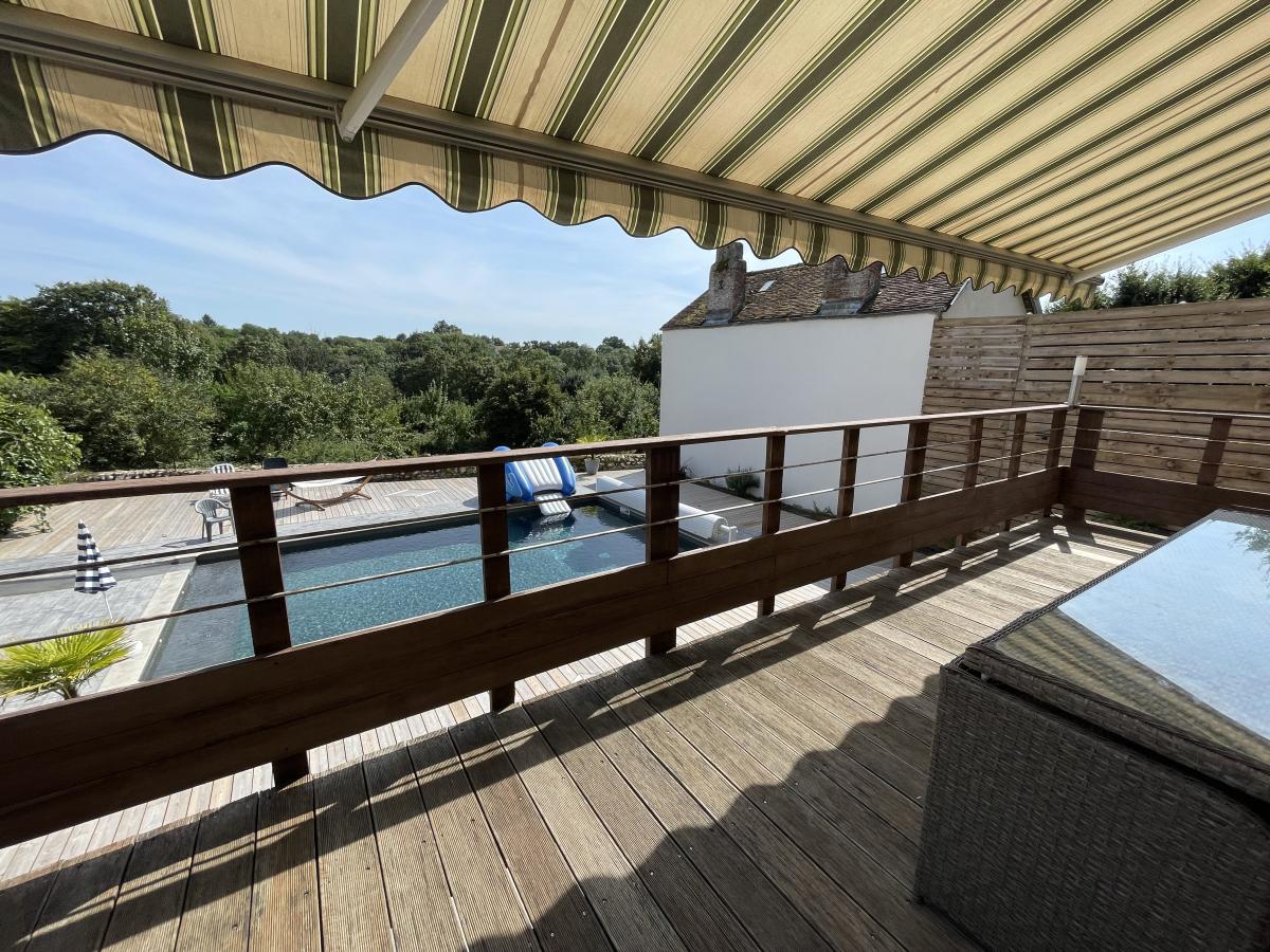 Vue panoramique sur le terrain et sur la nature depuis la terrasse arrière sur pilotis, le tout sur 1400 m² . Piscine naturelle chauffée (5m x 9m), eau drainée par des plantes, sans chlore, avec rideau de sécurité.