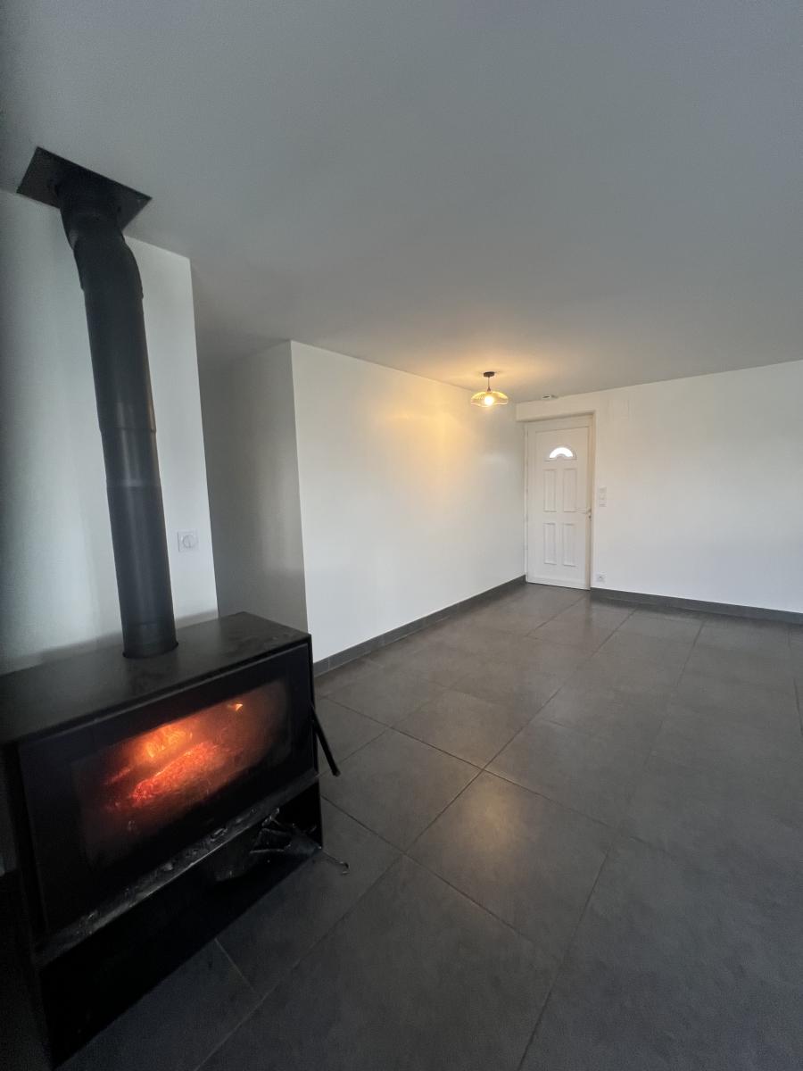 Belle pièce de séjour de 61 m² avec grandes baies vitrées (cuisine équipée, séjour et salon avec poêle à bois), 3 chambres, salle d'eau, WC, buanderie.