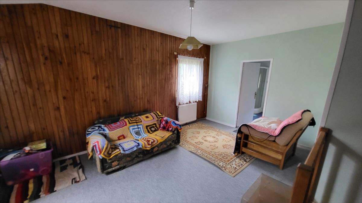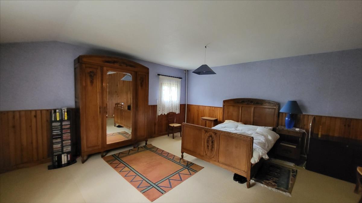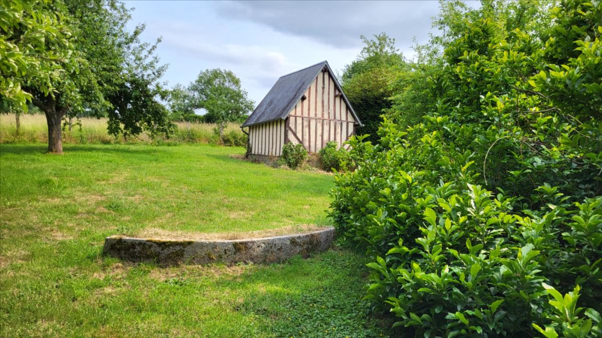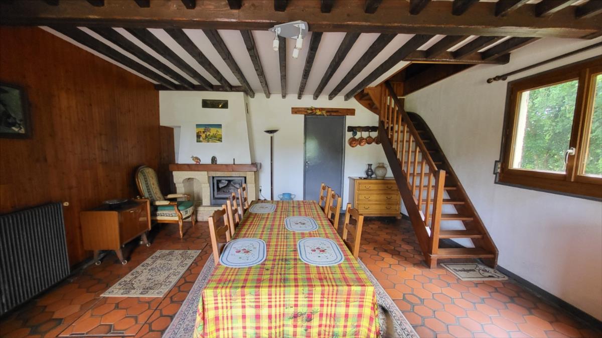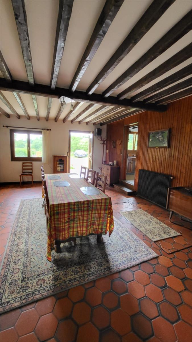 Maison d'environ 170 m² : salle à manger avec escalier, cuisine rustique, salon, couloir, salle de douche, wc séparés, coin buanderie, deux chambres, chaufferie avec chaudière au fioul, cuve et chauffe-eau. à l'étage : palier, pièce-dégagement, deux chambres, salle de douche avec wc, bureau.Petit bâtiment en colombage. Garage. Beau terrain avec verger.