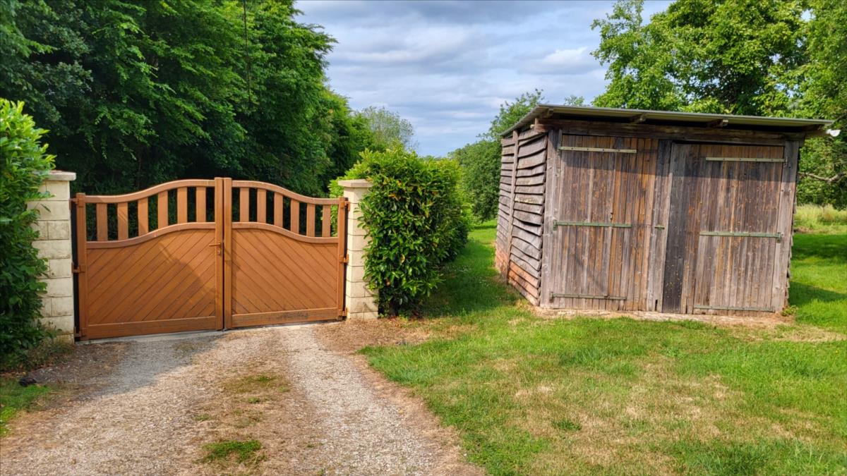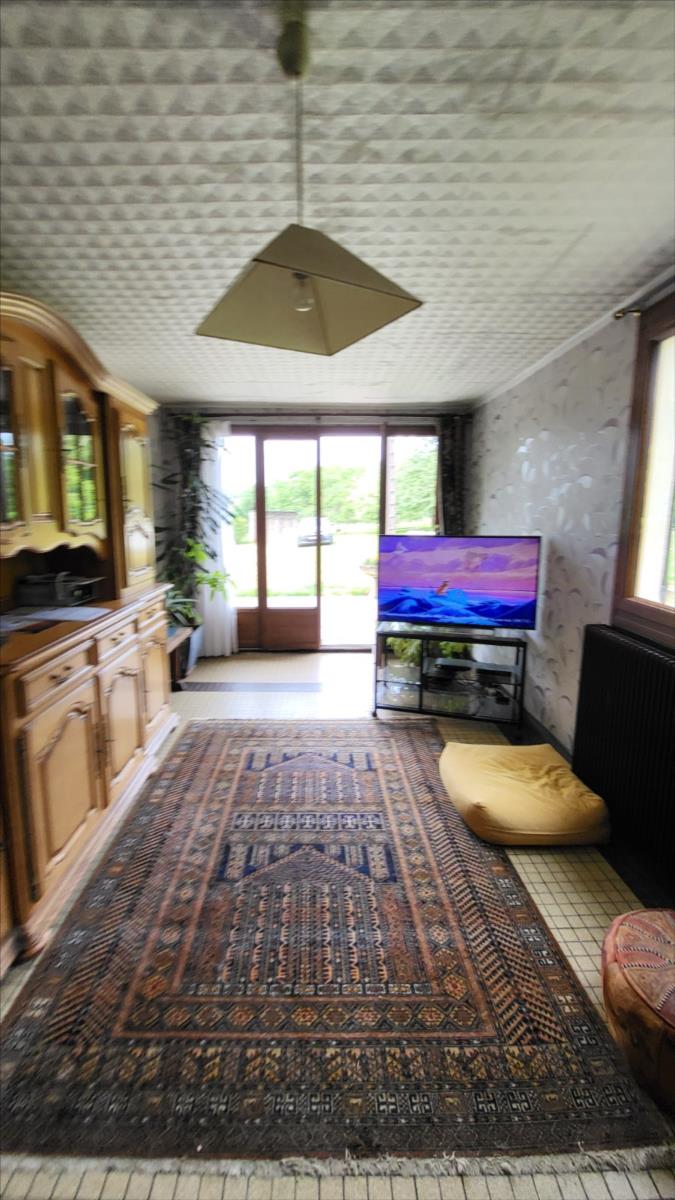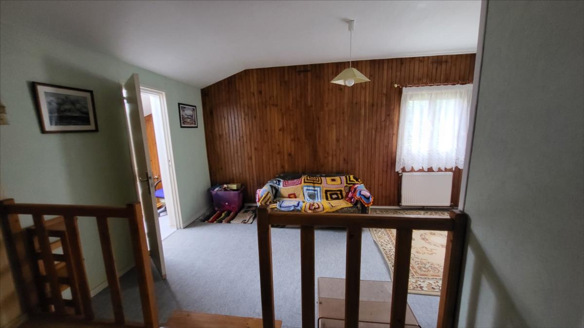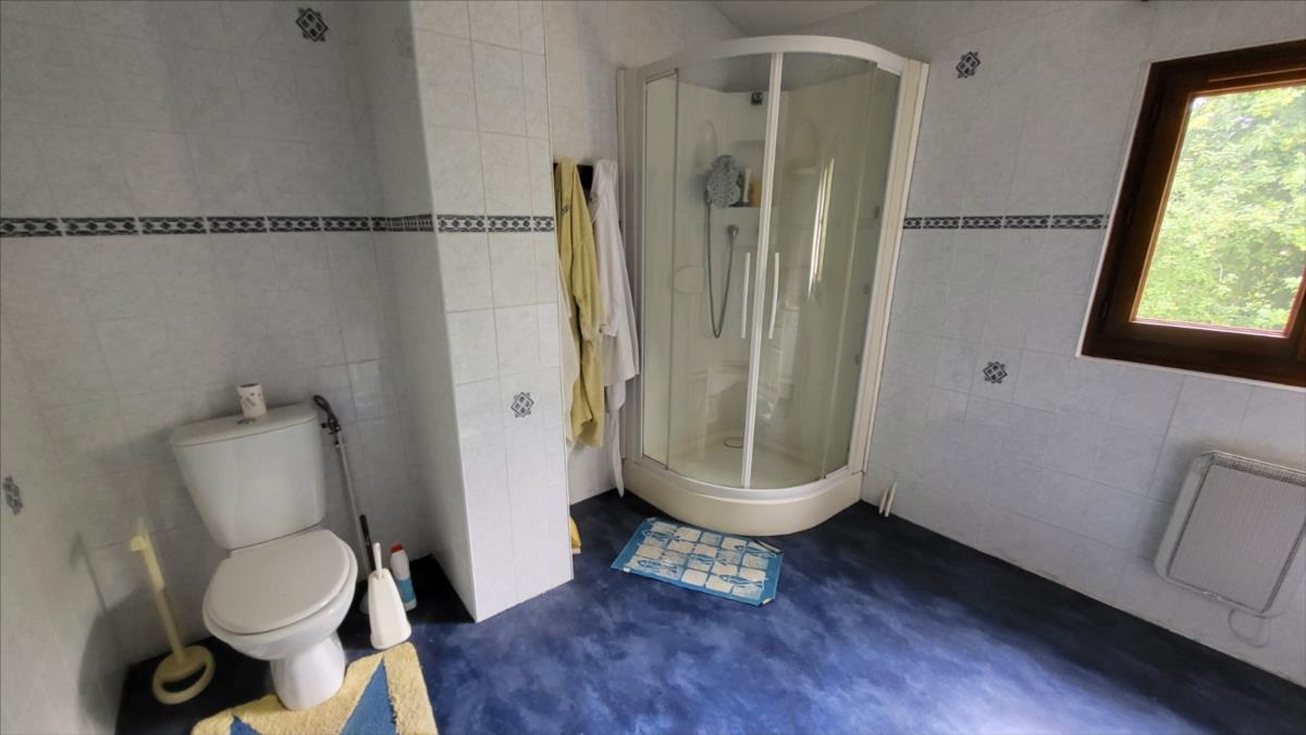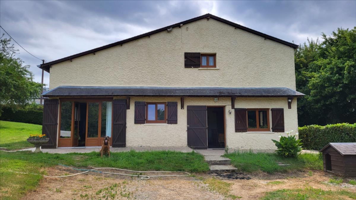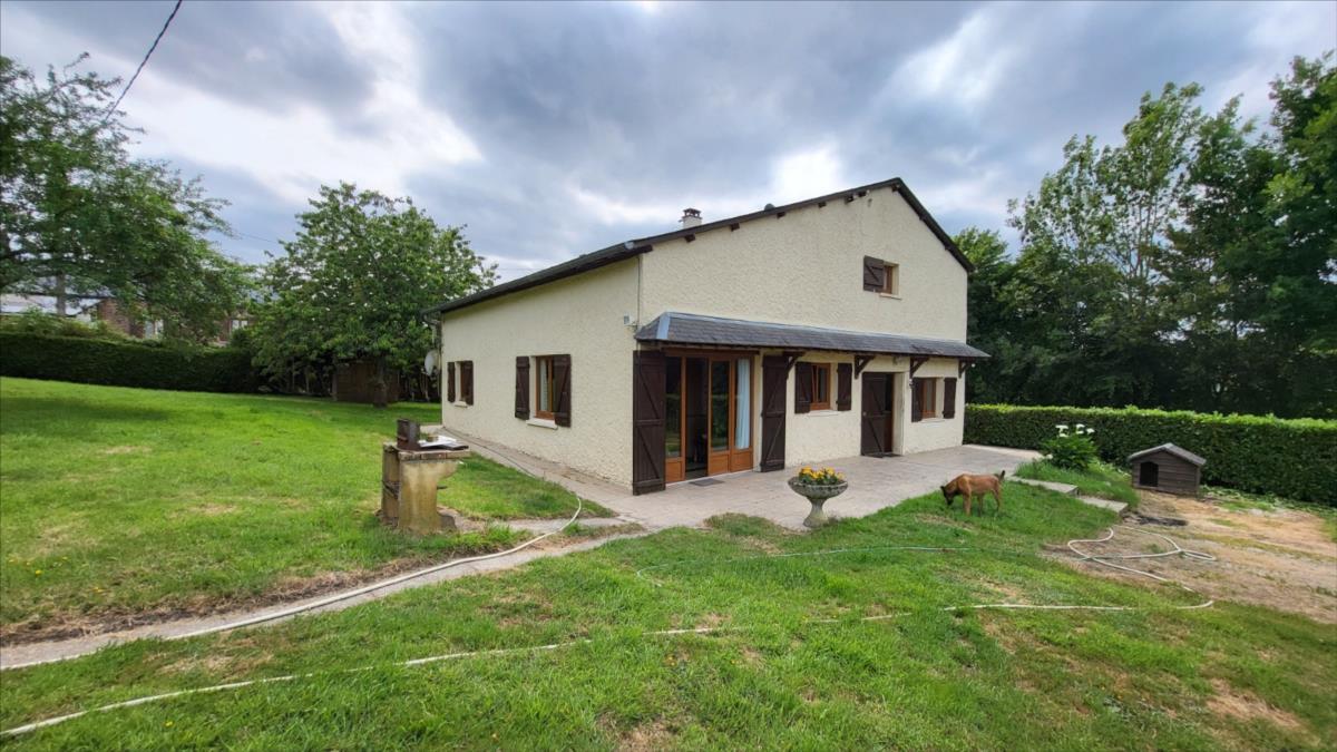Maison d'environ 170 m² : salle à manger avec escalier, cuisine rustique, salon, couloir, salle de douche, wc séparés, coin buanderie, deux chambres, chaufferie avec chaudière au fioul, cuve et chauffe-eau. à l'étage : palier, pièce-dégagement, deux chambres, salle de douche avec wc, bureau.Petit bâtiment en colombage. Garage. Beau terrain avec verger.